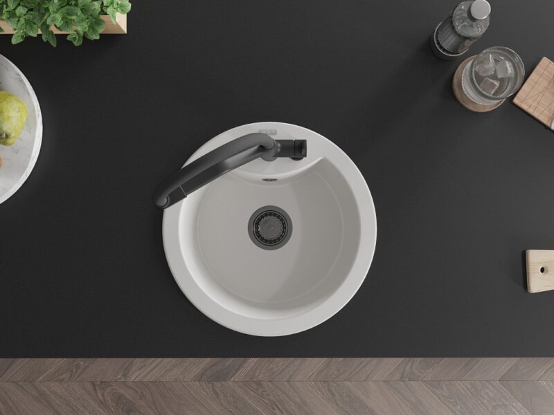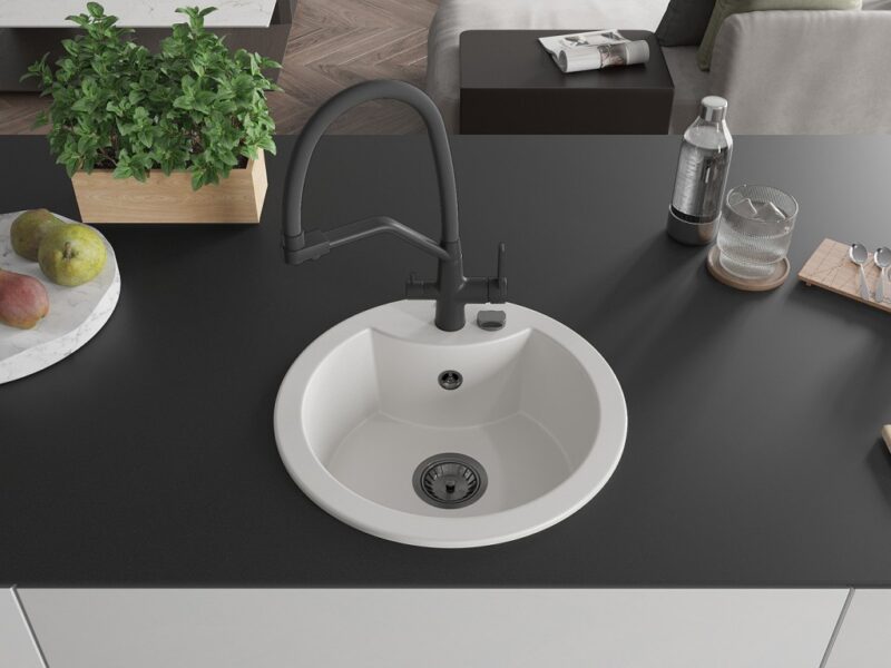 Technické dáta: drez: Rozmery: 488 x 488 x 167 mm Hĺbka komory: 157 mm Šírka komory: 406 mm Priemer odtoku: ø90 mm Typ: 1-komorový Typ: Zapustené do pracovnej dosky biela farba Povrchová úprava sifónu: čierna Materiál: žula (80% žulové kamenivo, 20% živice) Prepadový otvor: Áno Otvory: (batérie, automatické) 2 Vysoká odolnosť proti poškriabaniu a zmene farby Odolnosť proti tepelným šokom Ľahko čistiteľný povrch Jeden dodatočný vyfrézovaný otvor na samodierovanie ø35 kuchynská batéria: Materiál: mosadz Čierna farba Hlavy: Keramické Prevzdušňovač: Áno Typ hubica: Flexibilný s mosadzným držiakom Rozsah výtoku: 260 mm Výška: 405 mm Typ: Dve rukoväte Dvojhlavá batéria s prídavným filtrom na pitnú vodu(GT) Ean: 5905315101570