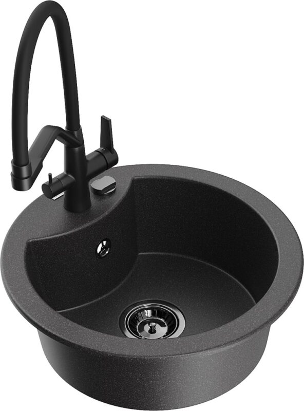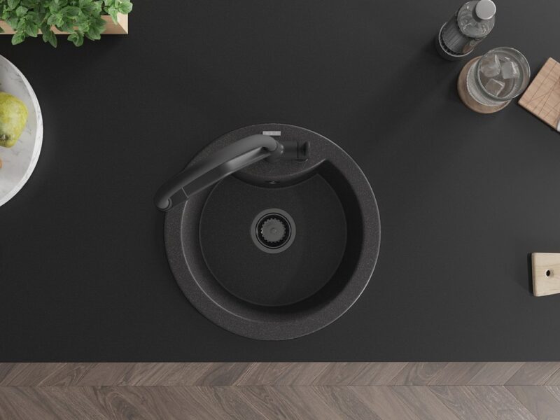 Technické dáta: drez: Rozmery: 488 x 488 x 167 mm Hĺbka komory: 157 mm Šírka komory: 406 mm Priemer odtoku: ø90 mm Typ: 1-komorový Typ: Zapustené do pracovnej dosky Farba: Škvrnitá čierna Povrchová úprava sifónu: čierna Materiál: žula (80% žulové kamenivo, 20% živice) Prepadový otvor: Áno Otvory: (batérie, automatické) 2 Vysoká odolnosť proti poškriabaniu a zmene farby Odolnosť proti tepelným šokom Ľahko čistiteľný povrch Jeden dodatočný vyfrézovaný otvor na samodierovanie ø35 kuchynská batéria: Materiál: mosadz Čierna farba Hlavy: Keramické Prevzdušňovač: Áno Typ hubica: Flexibilný s mosadzným držiakom Rozsah výtoku: 260 mm Výška: 405 mm Typ: Dve rukoväte Dvojhlavá batéria s prídavným filtrom na pitnú vodu(GT) Ean: 5905315101822