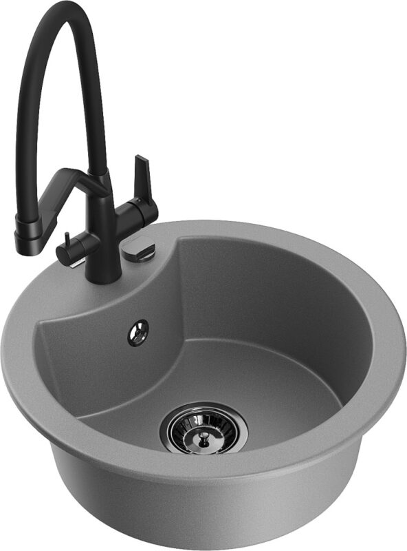 Technické dáta: drez: Rozmery: 488 x 488 x 167 mm Hĺbka komory: 157 mm Šírka komory: 406 mm Priemer odtoku: ø90 mm Typ: 1-komorový Typ: Zapustené do pracovnej dosky Šedá farba Povrchová úprava sifónu: čierna Materiál: žula (80% žulové kamenivo, 20% živice) Prepadový otvor: Áno Otvory: (batérie, automatické) 2 Vysoká odolnosť proti poškriabaniu a zmene farby Odolnosť proti tepelným šokom Ľahko čistiteľný povrch Jeden dodatočný vyfrézovaný otvor na samodierovanie ø35 kuchynská batéria: Materiál: mosadz Čierna farba Hlavy: Keramické Prevzdušňovač: Áno Typ hubica: Flexibilný s mosadzným držiakom Rozsah výtoku: 260 mm Výška: 405 mm Typ: Dve rukoväte Dvojhlavá batéria s prídavným filtrom na pitnú vodu(GT) Ean: 5905315101679