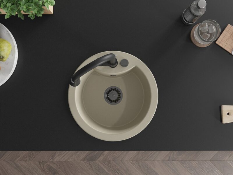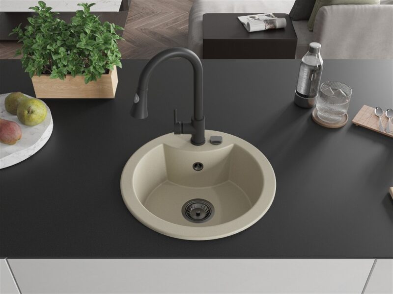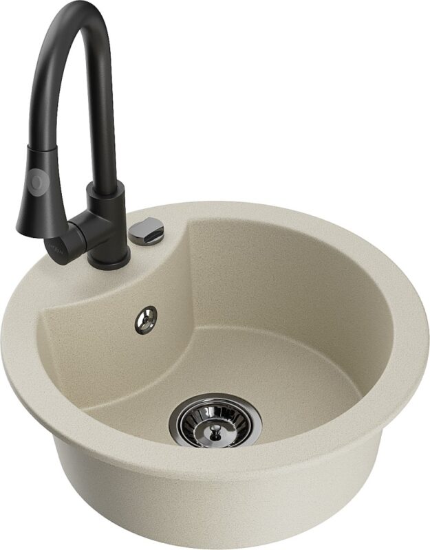 Technické dáta: Drez: Rozmer: 488x488x167 mm Hĺbka komory: 157 mm Šírka komory: 406 mm Priemer odtoku: ø90 mm Typ: 1-komorový Typ: Zapustené do pracovnej dosky Farba béžová Povrchová úprava sifónu: čierna Materiál: žula (80% žulové kamenivo 20% živice) Prepadový otvor: Áno Otvory: (batérie, automat) 2 Vysoká odolnosť proti poškriabaniu a zmene farby Odolnosť proti tepelným šokom Povrch pre ľahké čistenie Jeden dodatočný vyfrézovaný otvor na samodierovanie ø35 Kuchynská batéria: Materiál: mosadz Čierna farba Hlava: Keramická Perlátor: Áno Typ: Jednopákové Výška batérie: 380 mm Rozsah výtoku: 252 mm Typ výtoku: Výsuvný(GT) Ean: 5905315030085