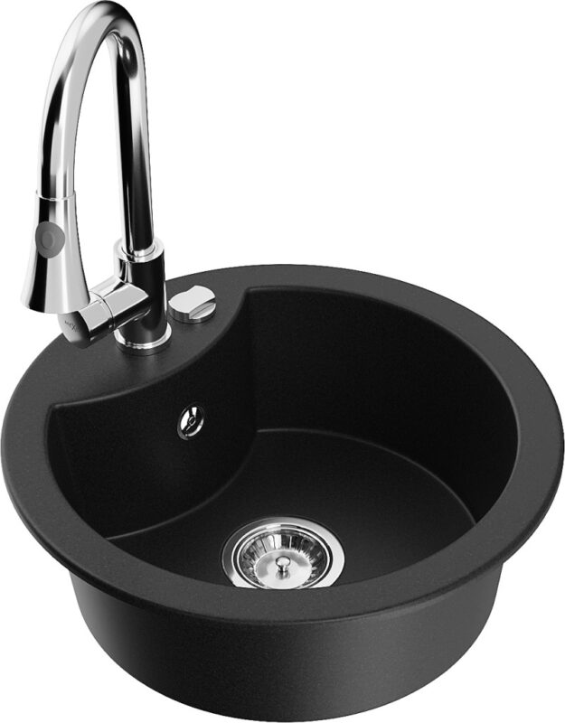 Technické dáta: drez: Rozmery: 488 x 488 x 167 mm Hĺbka komory: 157 mm Šírka komory: 406 mm Priemer odtoku: ø90 mm Typ: 1-komorový Typ: Zapustené do pracovnej dosky Čierna farba Povrchová úprava sifónu: Chrome Materiál: žula (80% žulové kamenivo, 20% živice) Prepadový otvor: Áno Otvory: (batérie, automatické) 2 Vysoká odolnosť proti poškriabaniu a zmene farby Odolnosť proti tepelným šokom Ľahko čistiteľný povrch Jeden dodatočný vyfrézovaný otvor na samodierovanie ø35 kuchynská batéria: Materiál: mosadz Farba: Chrome Hlava: Keramická Prevzdušňovač: Áno Typ: Jedna páka Výška batérie: 380 mm Rozsah výtoku: 252 mm Typ výtoku: Výsuvný(GT) Ean: 5905315030283