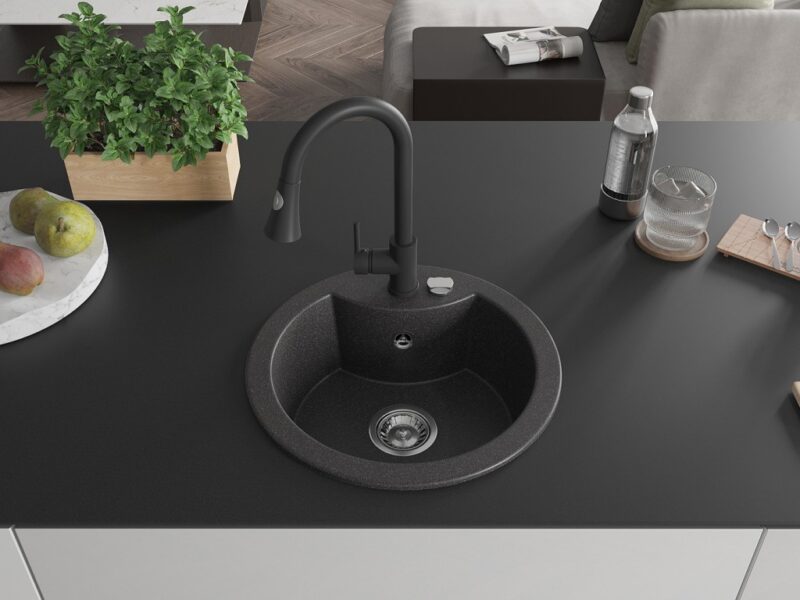 Technické dáta: drez: Rozmery: 488 x 488 x 167 mm Hĺbka komory: 157 mm Šírka komory: 406 mm Priemer odtoku: ø90 mm Typ: 1-komorový Typ: Zapustené do pracovnej dosky Farba: Škvrnitá čierna Povrchová úprava sifónu: Chrome Materiál: žula (80% žulové kamenivo, 20% živice) Prepadový otvor: Áno Otvory: (batérie, automatické) 2 Vysoká odolnosť proti poškriabaniu a zmene farby Odolnosť proti tepelným šokom Ľahko čistiteľný povrch Jeden dodatočný vyfrézovaný otvor na samodierovanie ø35 kuchynská batéria: Materiál: mosadz Čierna farba Hlava: Keramická Prevzdušňovač: Áno Typ: Jedna páka Výška batérie: 380 mm Rozsah výtoku: 252 mm Typ výtoku: Výsuvný(GT) Ean: 5905315030252