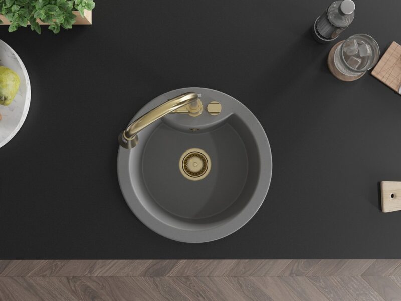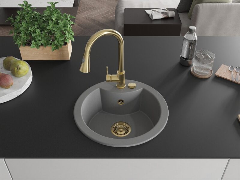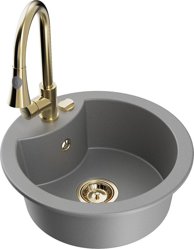 Technické dáta: drez: Rozmery: 488 x 488 x 167 mm Hĺbka komory: 157 mm Šírka komory: 406 mm Priemer odtoku: ø90 mm Typ: 1-komorový Typ: Zapustené do pracovnej dosky Šedá farba Povrchová úprava sifónu: zlatá Materiál: žula (80% žulové kamenivo, 20% živice) Prepadový otvor: Áno Otvory: (batérie, automatické) 2 Vysoká odolnosť proti poškriabaniu a zmene farby Odolnosť proti tepelným šokom Ľahko čistiteľný povrch Jeden dodatočný vyfrézovaný otvor na samodierovanie ø35 kuchynská batéria: Materiál: mosadz Farba: Zlatá Hlava: Keramická Prevzdušňovač: Áno Typ: Jedna páka Výška batérie: 380 mm Rozsah výtoku: 252 mm Typ výtoku: Výsuvný(GT) Ean: 5905315030108