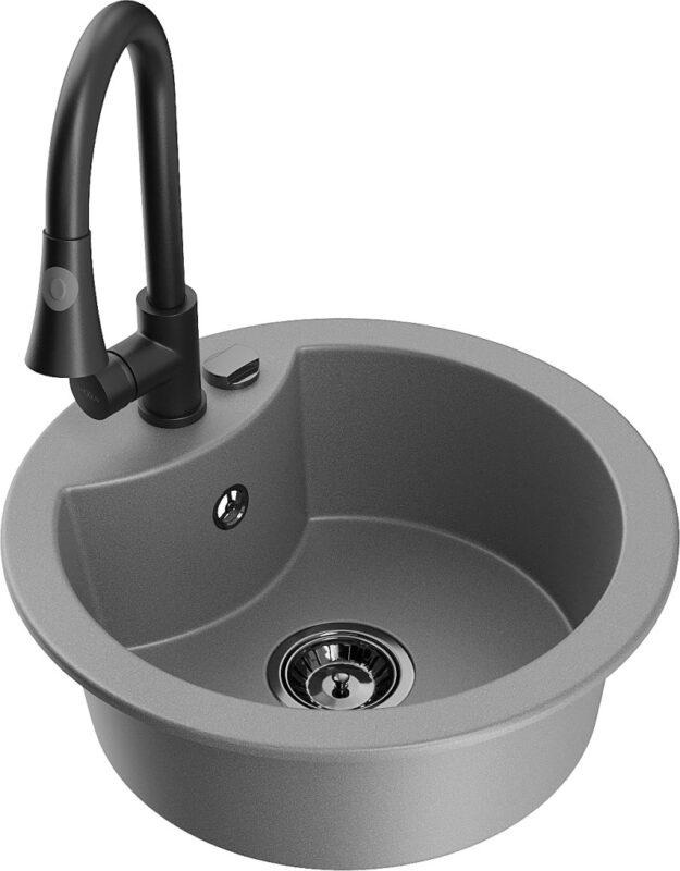 Technické dáta: drez: Rozmery: 488 x 488 x 167 mm Hĺbka komory: 157 mm Šírka komory: 406 mm Priemer odtoku: ø90 mm Typ: 1-komorový Typ: Zapustené do pracovnej dosky Šedá farba Povrchová úprava sifónu: čierna Materiál: žula (80% žulové kamenivo, 20% živice) Prepadový otvor: Áno Otvory: (batérie, automatické) 2 Vysoká odolnosť proti poškriabaniu a zmene farby Odolnosť proti tepelným šokom Ľahko čistiteľný povrch Jeden dodatočný vyfrézovaný otvor na samodierovanie ø35 kuchynská batéria: Materiál: mosadz Čierna farba Hlava: Keramická Prevzdušňovač: Áno Typ: Jedna páka Výška batérie: 380 mm Rozsah výtoku: 252 mm Typ výtoku: Výsuvný(GT) Ean: 5905315030122