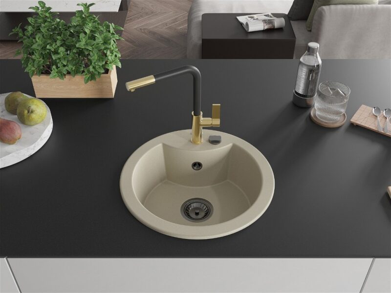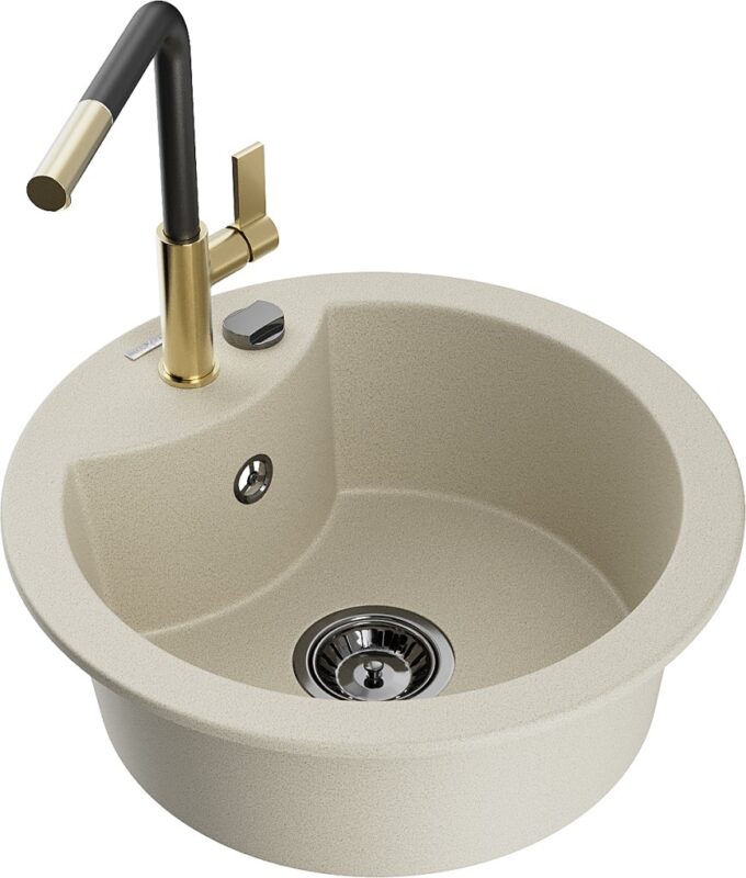 Technické dáta: Drez: Rozmer: 488x488x167 mm Hĺbka komory: 157 mm Šírka komory: 406 mm Priemer odtoku: ø90 mm Typ: 1-komorový Typ: Zapustené do pracovnej dosky Farba béžová Povrchová úprava sifónu: čierna Materiál: žula (80% žulové kamenivo 20% živice) Prepadový otvor: Áno Otvory: (batérie, automat) 2 Vysoká odolnosť proti poškriabaniu a zmene farby Odolnosť proti tepelným šokom Povrch pre ľahké čistenie Jeden dodatočný vyfrézovaný otvor na samodierovanie ø35 Kuchynská batéria: Materiál: mosadz Farba: Zlatá/Čierna Hlava: Keramická Perlátor: Áno Typ: Jednopákové Rozsah výtoku: 245 mm Výška batérie: 307 mm(GT) Ean: 5905315060587
