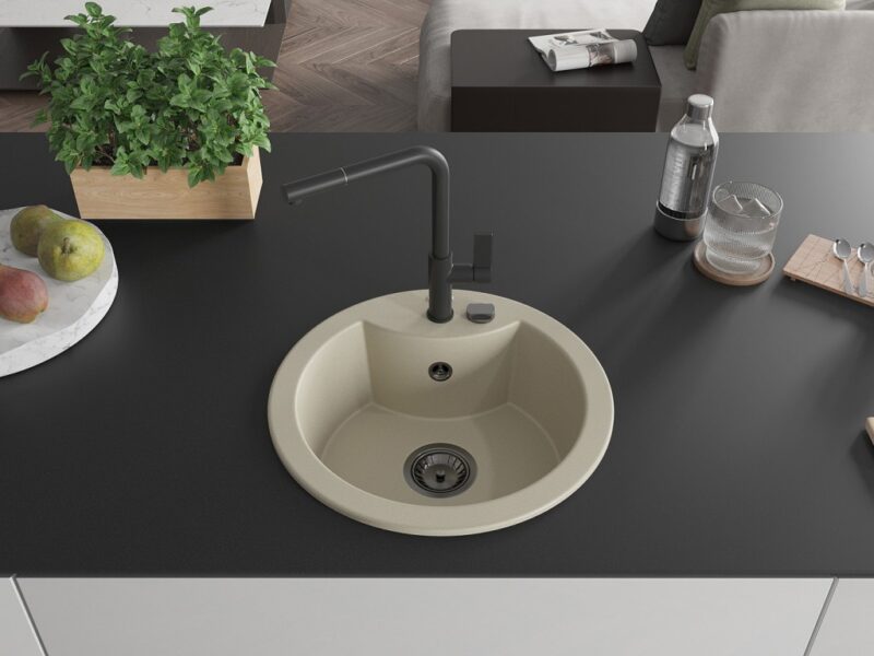 Technické dáta: Drez: Rozmer: 488x488x167 mm Hĺbka komory: 157 mm Šírka komory: 406 mm Priemer odtoku: ø90 mm Typ: 1-komorový Typ: Zapustené do pracovnej dosky Farba béžová Povrchová úprava sifónu: čierna Materiál: žula (80% žulové kamenivo 20% živice) Prepadový otvor: Áno Otvory: (batérie, automat) 2 Vysoká odolnosť proti poškriabaniu a zmene farby Odolnosť proti tepelným šokom Povrch pre ľahké čistenie Jeden dodatočný vyfrézovaný otvor na samodierovanie ø35 Kuchynská batéria: Materiál: mosadz Čierna farba Hlava: Keramická Perlátor: Áno Typ: Jednopákové Rozsah výtoku: 245 mm Výška batérie: 307 mm(GT) Ean: 5905315060594