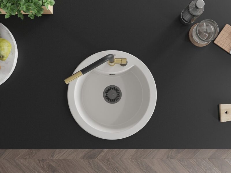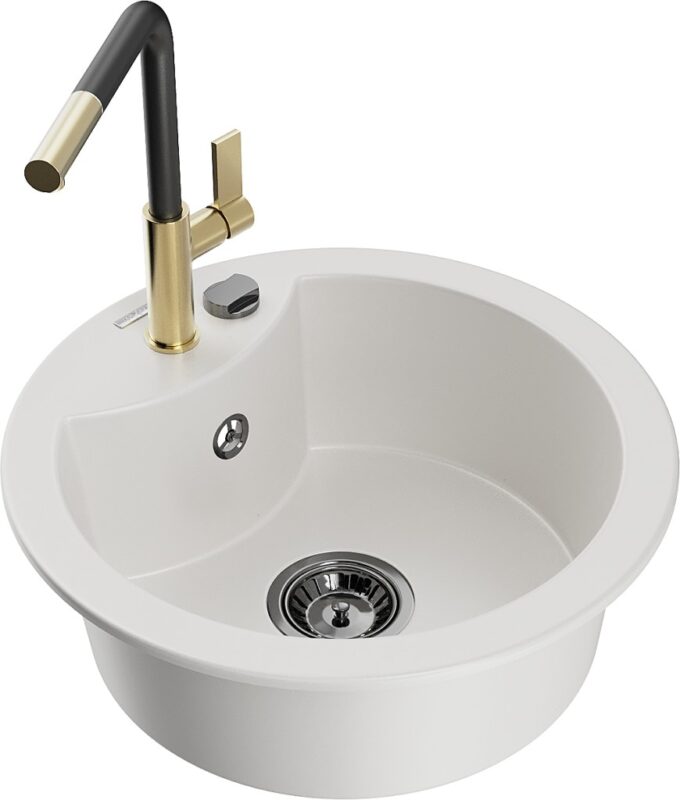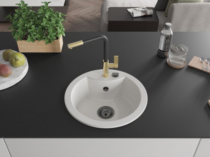 Technické dáta: drez: Rozmery: 488 x 488 x 167 mm Hĺbka komory: 157 mm Šírka komory: 406 mm Priemer odtoku: ø90 mm Typ: 1-komorový Typ: Zapustené do pracovnej dosky biela farba Povrchová úprava sifónu: čierna Materiál: žula (80% žulové kamenivo, 20% živice) Prepadový otvor: Áno Otvory: (batérie, automatické) 2 Vysoká odolnosť proti poškriabaniu a zmene farby Odolnosť proti tepelným šokom Ľahko čistiteľný povrch Jeden dodatočný vyfrézovaný otvor na samodierovanie ø35 kuchynská batéria: Materiál: mosadz Farba: Zlatá/Čierna Hlava: Keramická Prevzdušňovač: Áno Typ: Jedna páka Rozsah výtoku: 245 mm Výška batérie: 307 mm(GT) Ean: 5905315060518