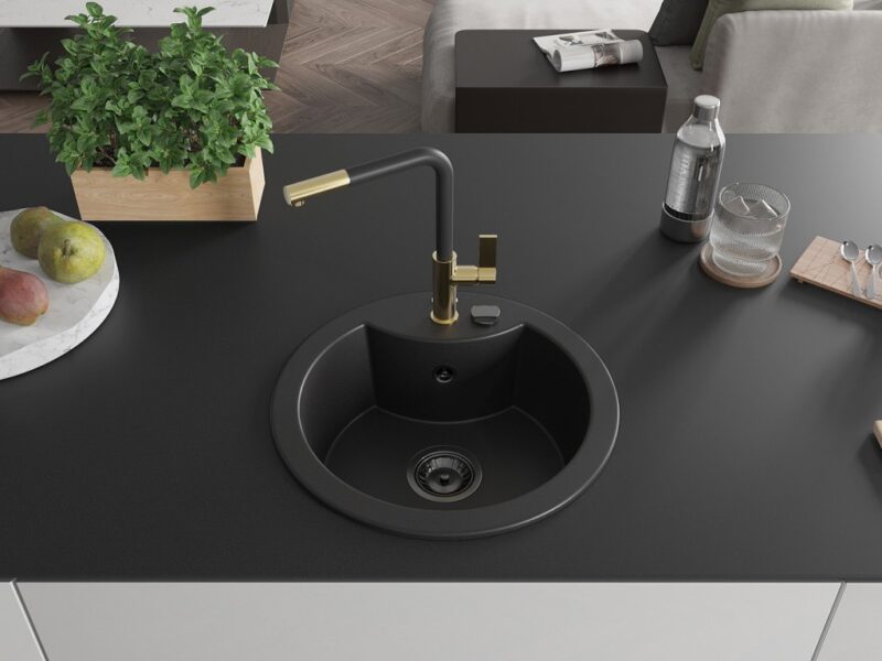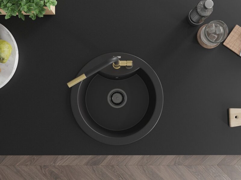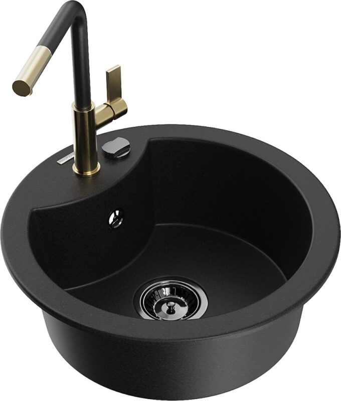 Technické dáta: drez: Rozmery: 488 x 488 x 167 mm Hĺbka komory: 157 mm Šírka komory: 406 mm Priemer odtoku: ø90 mm Typ: 1-komorový Typ: Zapustené do pracovnej dosky Čierna farba Povrchová úprava sifónu: čierna Materiál: žula (80% žulové kamenivo, 20% živice) Prepadový otvor: Áno Otvory: (batérie, automatické) 2 Vysoká odolnosť proti poškriabaniu a zmene farby Odolnosť proti tepelným šokom Ľahko čistiteľný povrch Jeden dodatočný vyfrézovaný otvor na samodierovanie ø35 kuchynská batéria: Materiál: mosadz Farba: Zlatá/Čierna Hlava: Keramická Prevzdušňovač: Áno Typ: Jedna páka Rozsah výtoku: 245 mm Výška batérie: 307 mm(GT) Ean: 5905315060938