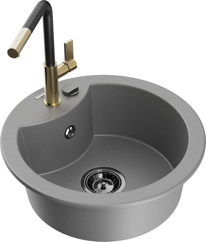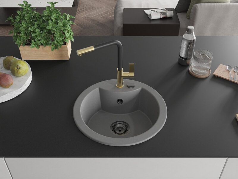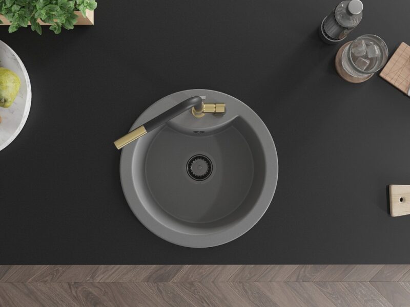 Technické dáta: drez: Rozmery: 488 x 488 x 167 mm Hĺbka komory: 157 mm Šírka komory: 406 mm Priemer odtoku: ø90 mm Typ: 1-komorový Typ: Zapustené do pracovnej dosky Šedá farba Povrchová úprava sifónu: čierna Materiál: žula (80% žulové kamenivo, 20% živice) Prepadový otvor: Áno Otvory: (batérie, automatické) 2 Vysoká odolnosť proti poškriabaniu a zmene farby Odolnosť proti tepelným šokom Ľahko čistiteľný povrch Jeden dodatočný vyfrézovaný otvor na samodierovanie ø35 kuchynská batéria: Materiál: mosadz Farba: Zlatá/Čierna Hlava: Keramická Prevzdušňovač: Áno Typ: Jedna páka Rozsah výtoku: 245 mm Výška batérie: 307 mm(GT) Ean: 5905315060655