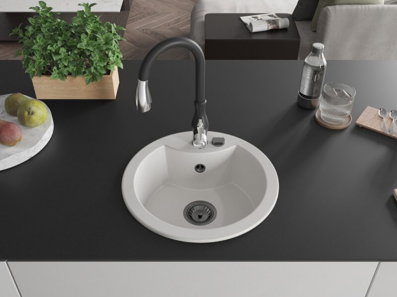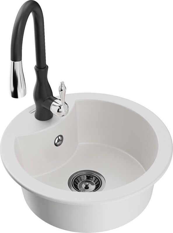 Technické dáta: drez: Rozmery: 488 x 488 x 167 mm Hĺbka komory: 157 mm Šírka komory: 406 mm Priemer odtoku: ø90 mm Typ: 1-komorový Typ: Zapustené do pracovnej dosky biela farba Povrchová úprava sifónu: čierna Materiál: žula (80% žulové kamenivo, 20% živice) Prepadový otvor: Áno Otvory: (batérie, automatické) 2 Vysoká odolnosť proti poškriabaniu a zmene farby Odolnosť proti tepelným šokom Ľahko čistiteľný povrch Jeden dodatočný vyfrézovaný otvor na samodierovanie ø35 kuchynská batéria: Materiál: mosadz Čierna farba Hlava: Keramická Prevzdušňovač: Áno Typ: Jedna páka Výška batérie: 410 mm Rozsah výtoku: 231 mm(GT) Ean: 5905315035158