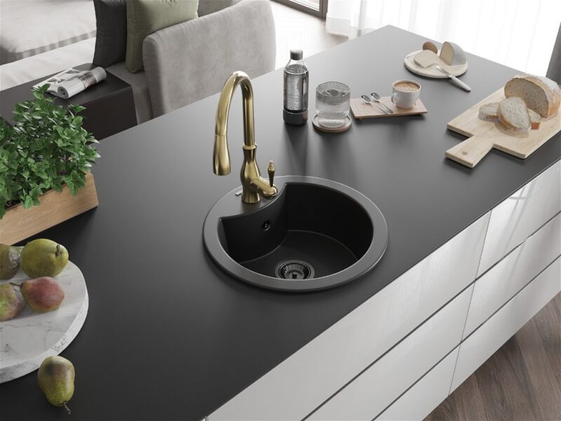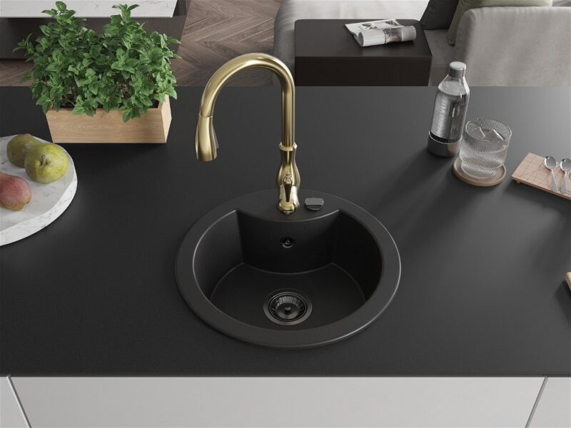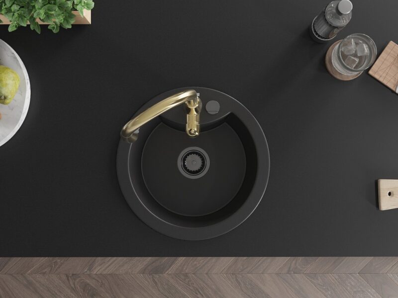 Technické dáta: drez: Rozmery: 488 x 488 x 167 mm Hĺbka komory: 157 mm Šírka komory: 406 mm Priemer odtoku: ø90 mm Typ: 1-komorový Typ: Zapustené do pracovnej dosky Čierna farba Povrchová úprava sifónu: čierna Materiál: žula (80% žulové kamenivo, 20% živice) Prepadový otvor: Áno Otvory: (batérie, automatické) 2 Vysoká odolnosť proti poškriabaniu a zmene farby Odolnosť proti tepelným šokom Ľahko čistiteľný povrch Jeden dodatočný vyfrézovaný otvor na samodierovanie ø35 kuchynská batéria: Materiál: mosadz Farba: Zlatá Hlava: Keramická Prevzdušňovač: Áno Typ: Jedna páka Výška batérie: 410 mm Rozsah výtoku: 231 mm(GT) Ean: 5905315035417