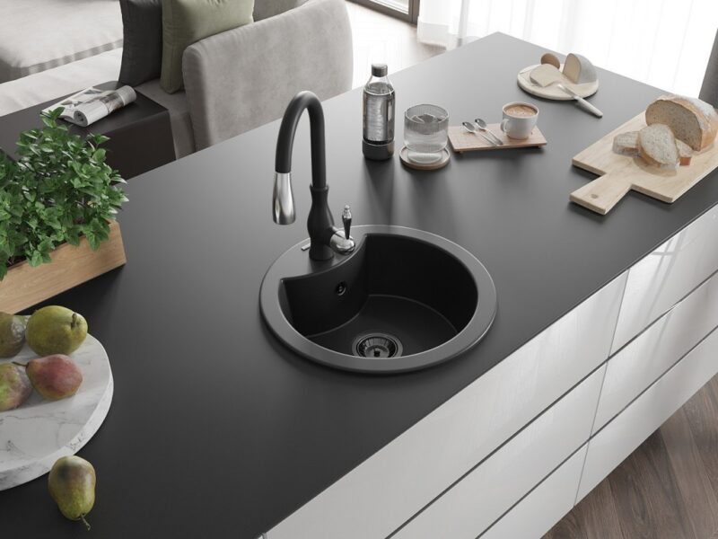 Technické dáta: drez: Rozmery: 488 x 488 x 167 mm Hĺbka komory: 157 mm Šírka komory: 406 mm Priemer odtoku: ø90 mm Typ: 1-komorový Typ: Zapustené do pracovnej dosky Čierna farba Povrchová úprava sifónu: čierna Materiál: žula (80% žulové kamenivo, 20% živice) Prepadový otvor: Áno Otvory: (batérie, automatické) 2 Vysoká odolnosť proti poškriabaniu a zmene farby Odolnosť proti tepelným šokom Ľahko čistiteľný povrch Jeden dodatočný vyfrézovaný otvor na samodierovanie ø35 kuchynská batéria: Materiál: mosadz Čierna farba Hlava: Keramická Prevzdušňovač: Áno Typ: Jedna páka Výška batérie: 410 mm Rozsah výtoku: 231 mm(GT) Ean: 5905315035424