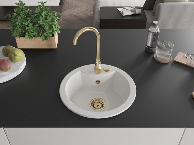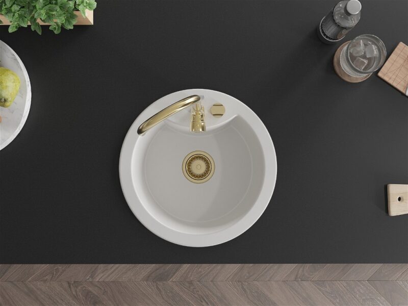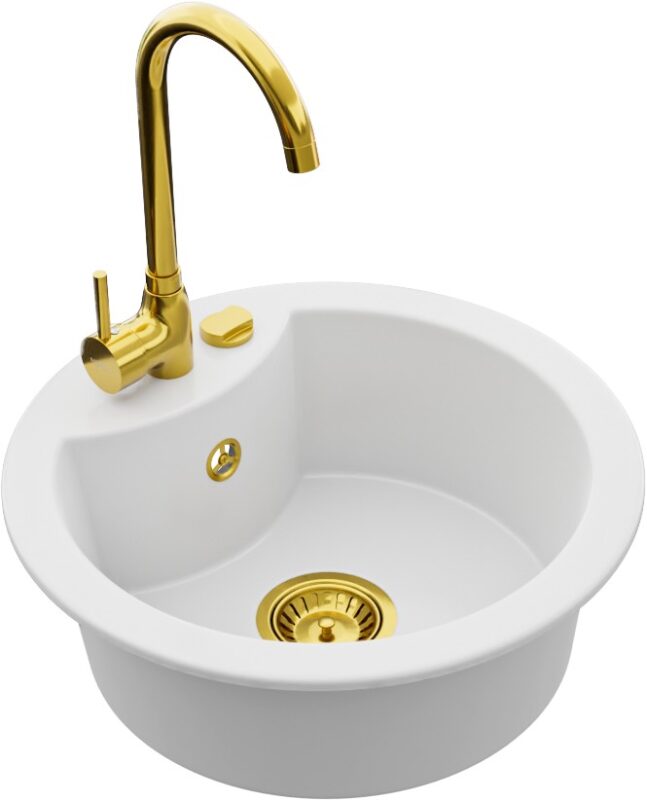 Technické dáta: drez: Rozmery: 488 x 488 x 167 mm Hĺbka komory: 157 mm Šírka komory: 406 mm Priemer odtoku: ø90 mm Typ: 1-komorový Typ: Zapustené do pracovnej dosky biela farba Povrchová úprava sifónu: zlatá Materiál: žula (80% žulové kamenivo, 20% živice) Prepadový otvor: Áno Otvory: (batérie, automatické) 2 Vysoká odolnosť proti poškriabaniu a zmene farby Odolnosť proti tepelným šokom Ľahko čistiteľný povrch Jeden dodatočný vyfrézovaný otvor na samodierovanie ø35 kuchynská batéria: Materiál: mosadz Farba: Zlatá Hlava: Keramická Prevzdušňovač: Áno Výška batérie: 335 mm Rozsah výtoku: 180 mm(GT) Ean: 5907709160484
