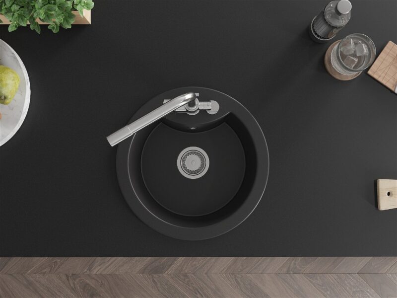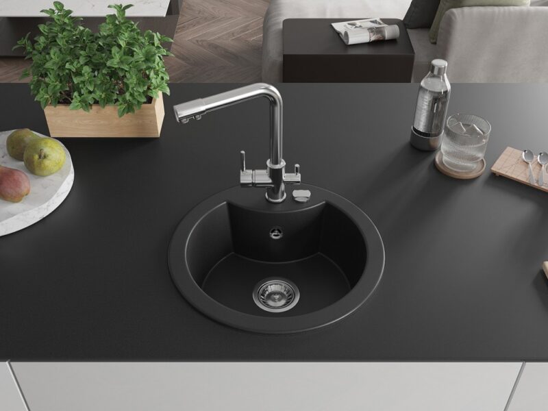Technické dáta: drez: Rozmery: 488 x 488 x 167 mm Hĺbka komory: 157 mm Šírka komory: 406 mm Priemer odtoku: ø90 mm Typ: 1-komorový Typ: Zapustené do pracovnej dosky Čierna farba Povrchová úprava sifónu: Chrome Materiál: žula (80% žulové kamenivo, 20% živice) Prepadový otvor: Áno Otvory: (batérie, automatické) 2 Vysoká odolnosť proti poškriabaniu a zmene farby Odolnosť proti tepelným šokom Ľahko čistiteľný povrch Jeden dodatočný vyfrézovaný otvor na samodierovanie ø35 kuchynská batéria: Materiál: mosadz Farba: Chrome Hlava: Keramická Prevzdušňovač: Áno Typ: Dve rukoväte Rozsah výtoku: 235 mm Výška batérie: 315 mm Dvojhlavá batéria s prídavným kanálom pre filtrovanú pitnú vodu(GT) Ean: 5905315025166