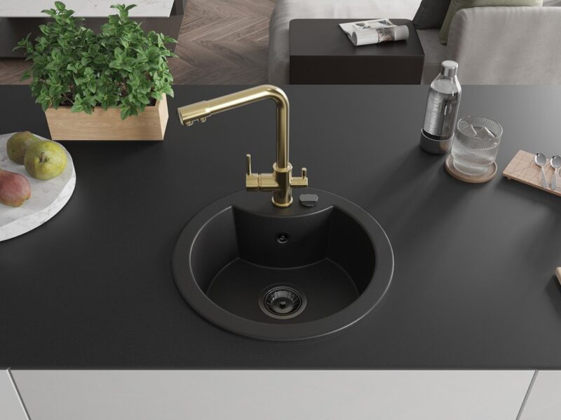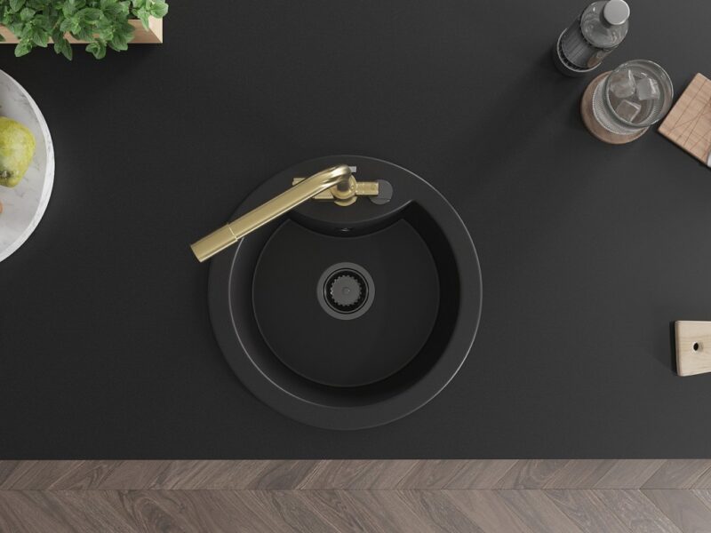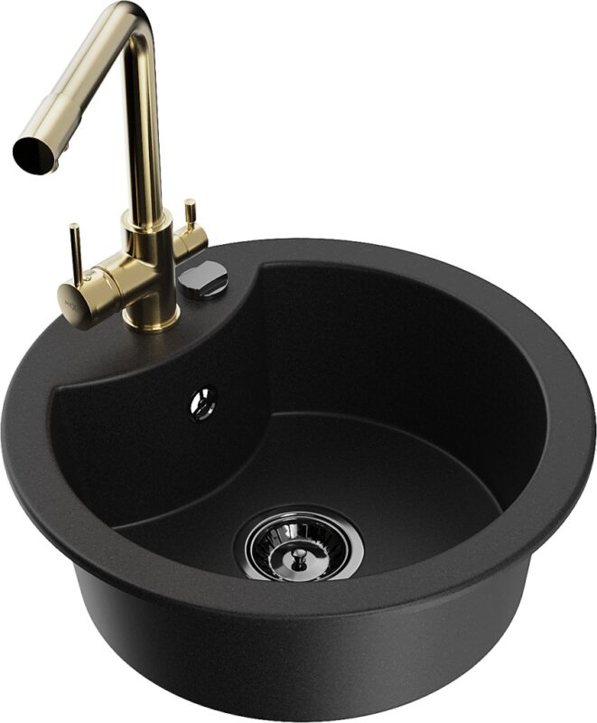 Technické dáta: drez: Rozmery: 488 x 488 x 167 mm Hĺbka komory: 157 mm Šírka komory: 406 mm Priemer odtoku: ø90 mm Typ: 1-komorový Typ: Zapustené do pracovnej dosky Čierna farba Povrchová úprava sifónu: čierna Materiál: žula (80% žulové kamenivo, 20% živice) Prepadový otvor: Áno Otvory: (batérie, automatické) 2 Vysoká odolnosť proti poškriabaniu a zmene farby Odolnosť proti tepelným šokom Ľahko čistiteľný povrch Jeden dodatočný vyfrézovaný otvor na samodierovanie ø35 kuchynská batéria: Materiál: mosadz Farba: Zlatá Hlava: Keramická Prevzdušňovač: Áno Typ: Dve rukoväte Rozsah výtoku: 235 mm Výška batérie: 315 mm Dvojhlavá batéria s prídavným kanálom pre filtrovanú pitnú vodu(GT) Ean: 5905315025180