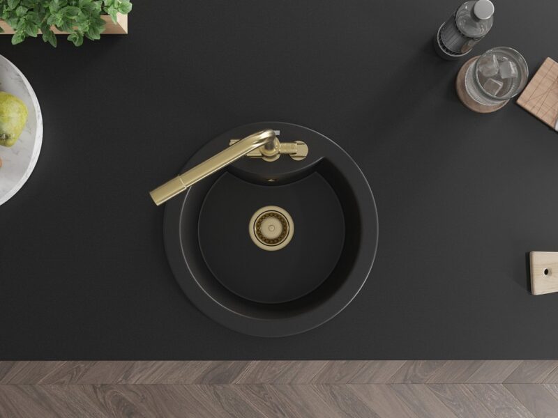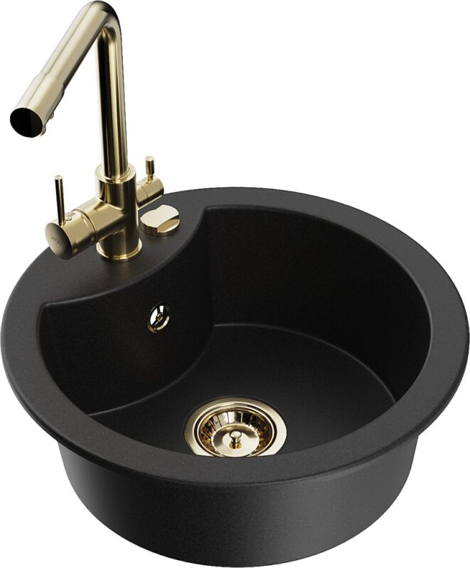 Technické dáta: drez: Rozmery: 488 x 488 x 167 mm Hĺbka komory: 157 mm Šírka komory: 406 mm Priemer odtoku: ø90 mm Typ: 1-komorový Typ: Zapustené do pracovnej dosky Čierna farba Povrchová úprava sifónu: zlatá Materiál: žula (80% žulové kamenivo, 20% živice) Prepadový otvor: Áno Otvory: (batérie, automatické) 2 Vysoká odolnosť proti poškriabaniu a zmene farby Odolnosť proti tepelným šokom Ľahko čistiteľný povrch Jeden dodatočný vyfrézovaný otvor na samodierovanie ø35 kuchynská batéria: Materiál: mosadz Farba: Zlatá Hlava: Keramická Prevzdušňovač: Áno Typ: Dve rukoväte Rozsah výtoku: 235 mm Výška batérie: 315 mm Dvojhlavá batéria s prídavným kanálom pre filtrovanú pitnú vodu(GT) Ean: 5905315025173