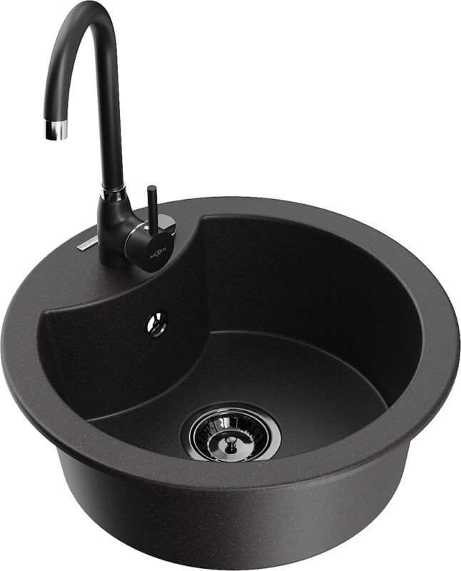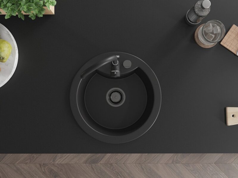 Technické dáta: drez: Rozmery: 488 x 488 x 167 mm Hĺbka komory: 157 mm Šírka komory: 406 mm Priemer odtoku: ø90 mm Typ: 1-komorový Typ: Zapustené do pracovnej dosky Čierna farba Povrchová úprava sifónu: čierna Materiál: žula (80% žulové kamenivo, 20% živice) Prepadový otvor: Áno Otvory: (batérie, automatické) 2 Vysoká odolnosť proti poškriabaniu a zmene farby Odolnosť proti tepelným šokom Ľahko čistiteľný povrch Jeden dodatočný vyfrézovaný otvor na samodierovanie ø35 kuchynská batéria: Materiál: mosadz Čierna farba Hlava: Keramická Prevzdušňovač: Áno Typ: Jedna páka Výška batérie: 335 mm Rozsah výtoku: 180 mm(GT) Ean: 5905315015419