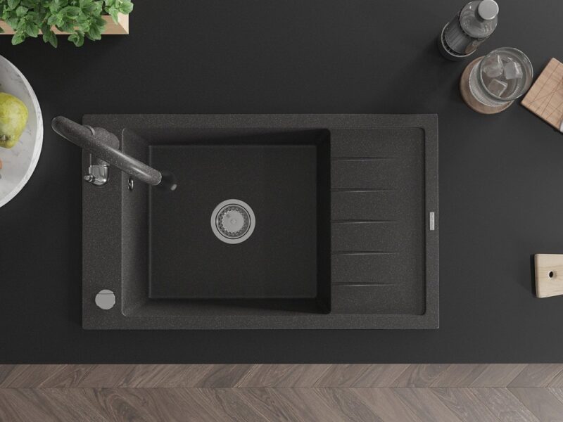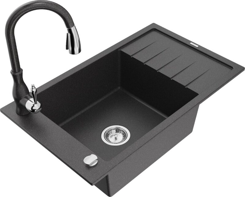 Technické dáta: drez: Rozmer: 795 x 480 x 200 mm Hĺbka komory: 190 mm Rozmery komory: 465×420 mm Priemer odtoku: ø90 mm Typ: 1-miska s krátkym odkvapkávačom Typ: Zapustené do pracovnej dosky Farba: Škvrnitá čierna Povrchová úprava sifónu: Chrome Materiál: žula (80% žulové kamenivo, 20% živice) Prepadový otvor: Áno Otvory: (batérie, automatické) 2 Inštalácia: Univerzálna, je možné inštalovať s odkvapkávačom na ľavú alebo pravú stranu Vysoká odolnosť proti poškriabaniu a zmene farby Odolnosť proti tepelným šokom Ľahko čistiteľný povrch Jeden dodatočný vyfrézovaný otvor na samodierovanie ø35 kuchynská batéria: Materiál: mosadz Farba: Škvrnitá čierna Hlava: Keramická Prevzdušňovač: Áno Typ: Jedna páka Výška batérie: 410 mm Rozsah výtoku: 231 mm(GT) Ean: 5905315035066