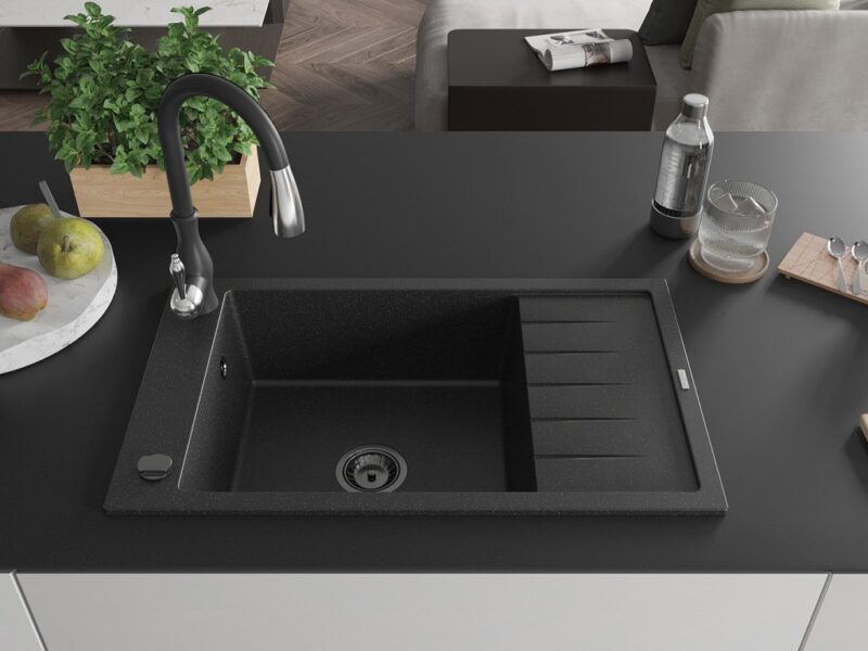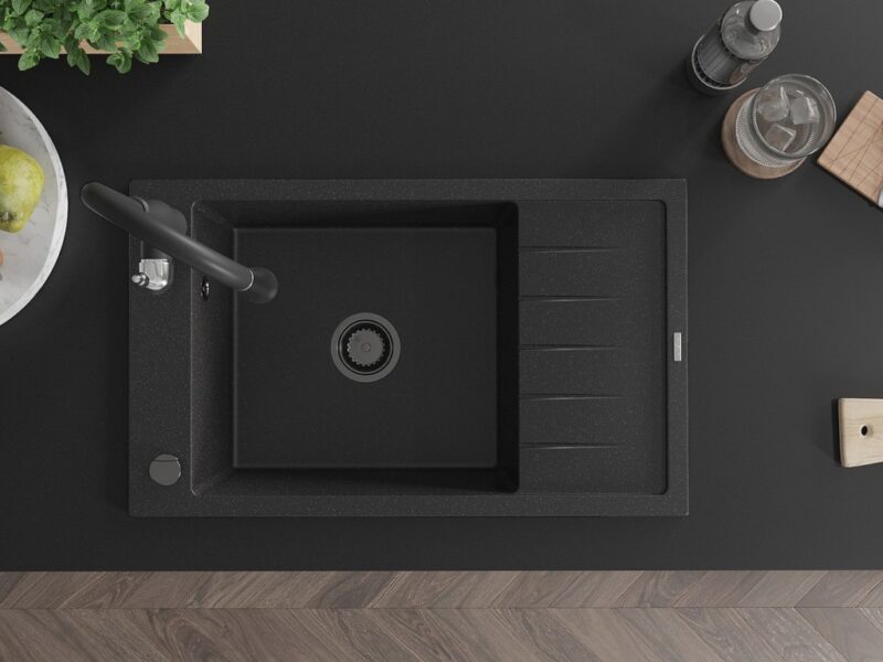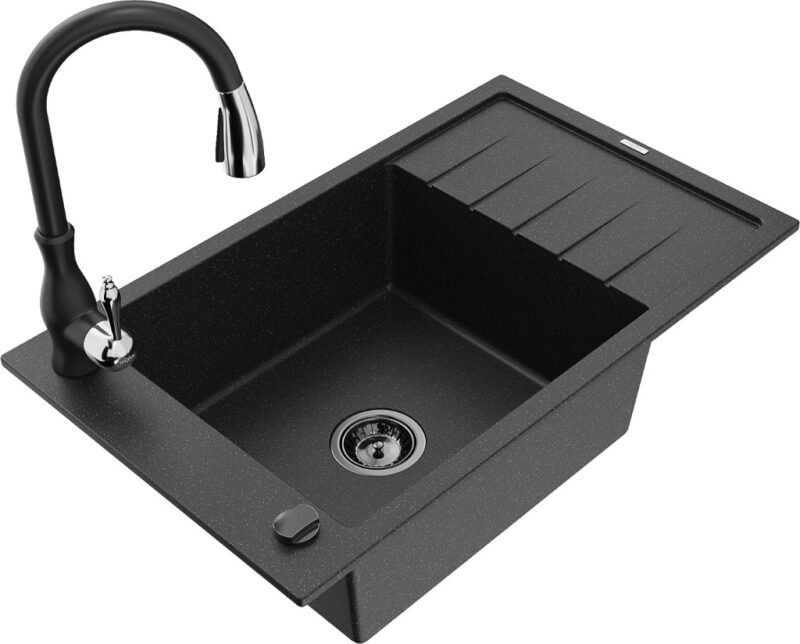 Technické dáta: drez: Rozmer: 795 x 480 x 200 mm Hĺbka komory: 190 mm Rozmery komory: 465×420 mm Priemer odtoku: ø90 mm Typ: 1-miska s krátkym odkvapkávačom Typ: Zapustené do pracovnej dosky Farba: čierna/strieborná metalíza Povrchová úprava sifónu: čierna Materiál: žula (80% žulové kamenivo, 20% živice) Prepadový otvor: Áno Otvory: (batérie, automatické) 2 Inštalácia: Univerzálna, je možné inštalovať s odkvapkávačom na ľavú alebo pravú stranu Vysoká odolnosť proti poškriabaniu a zmene farby Odolnosť proti tepelným šokom Ľahko čistiteľný povrch Jeden dodatočný vyfrézovaný otvor na samodierovanie ø35 kuchynská batéria: Materiál: mosadz Čierna farba Hlava: Keramická Prevzdušňovač: Áno Typ: Jedna páka Výška batérie: 410 mm Rozsah výtoku: 231 mm(GT) Ean: 5905315034953