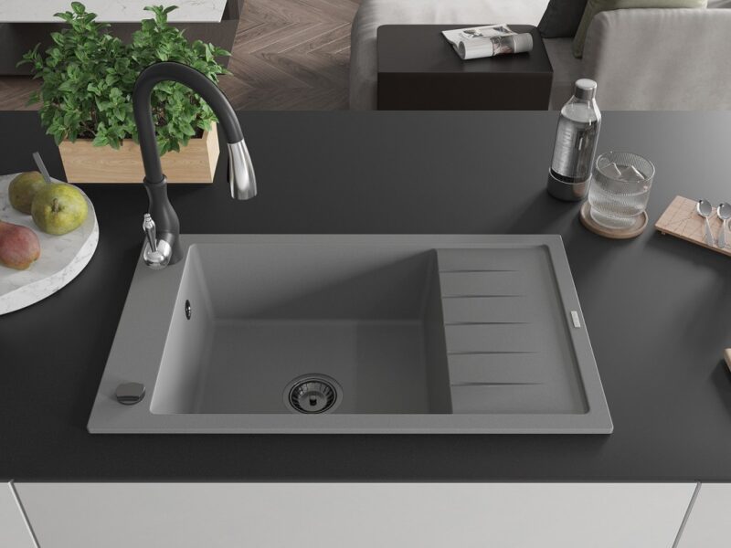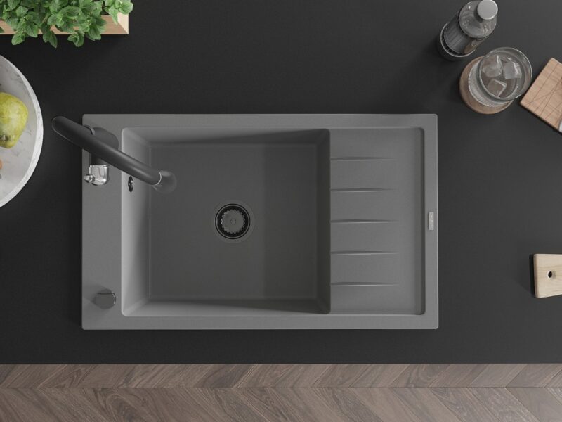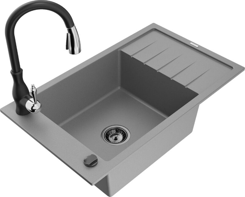 Technické dáta: drez: Rozmer: 795 x 480 x 200 mm Hĺbka komory: 190 mm Rozmery komory: 465×420 mm Priemer odtoku: ø90 mm Typ: 1-miska s krátkym odkvapkávačom Typ: Zapustené do pracovnej dosky Šedá farba Povrchová úprava sifónu: čierna Materiál: žula (80% žulové kamenivo, 20% živice) Prepadový otvor: Áno Otvory: (batérie, automatické) 2 Inštalácia: Univerzálna, je možné inštalovať s odkvapkávačom na ľavú alebo pravú stranu Vysoká odolnosť proti poškriabaniu a zmene farby Odolnosť proti tepelným šokom Ľahko čistiteľný povrch Jeden dodatočný vyfrézovaný otvor na samodierovanie ø35 kuchynská batéria: Materiál: mosadz Čierna farba Hlava: Keramická Prevzdušňovač: Áno Typ: Jedna páka Výška batérie: 410 mm Rozsah výtoku: 231 mm(GT) Ean: 5905315034915