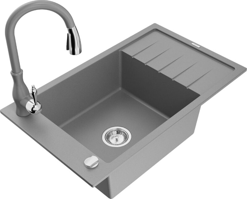 Technické dáta: drez: Rozmer: 795 x 480 x 200 mm Hĺbka komory: 190 mm Rozmery komory: 465×420 mm Priemer odtoku: ø90 mm Typ: 1-miska s krátkym odkvapkávačom Typ: Zapustené do pracovnej dosky Šedá farba Povrchová úprava sifónu: Chrome Materiál: žula (80% žulové kamenivo, 20% živice) Prepadový otvor: Áno Otvory: (batérie, automatické) 2 Inštalácia: Univerzálna, je možné inštalovať s odkvapkávačom na ľavú alebo pravú stranu Vysoká odolnosť proti poškriabaniu a zmene farby Odolnosť proti tepelným šokom Ľahko čistiteľný povrch Jeden dodatočný vyfrézovaný otvor na samodierovanie ø35 kuchynská batéria: Materiál: mosadz Šedá farba Hlava: Keramická Prevzdušňovač: Áno Typ: Jedna páka Výška batérie: 410 mm Rozsah výtoku: 231 mm(GT) Ean: 5905315034922