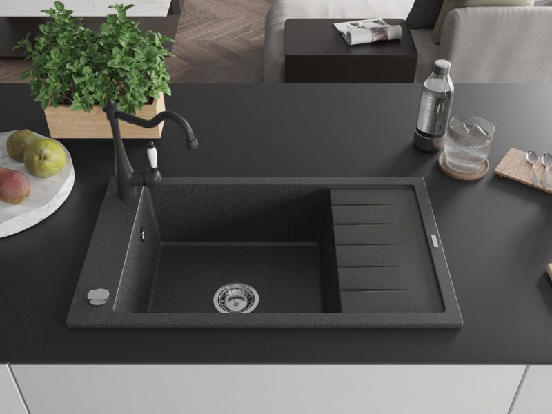 Technické dáta: drez: Rozmer: 795 x 480 x 200 mm Hĺbka komory: 190 mm Rozmery komory: 465×420 mm Priemer odtoku: ø90 mm Typ: 1-miska s krátkym odkvapkávačom Typ: Zapustené do pracovnej dosky Farba: Škvrnitá čierna Povrchová úprava sifónu: Chrome Materiál: žula (80% žulové kamenivo, 20% živice) Prepadový otvor: Áno Otvory: (batérie, automatické) 2 Inštalácia: Univerzálna, je možné inštalovať s odkvapkávačom na ľavú alebo pravú stranu Vysoká odolnosť proti poškriabaniu a zmene farby Odolnosť proti tepelným šokom Ľahko čistiteľný povrch Jeden dodatočný vyfrézovaný otvor na samodierovanie ø35 kuchynská batéria: Materiál: mosadz Čierna farba Hlava: Keramická Prevzdušňovač: Áno Typ: Jedna páka Výška batérie: 290 mm Rozsah výtoku: 260 mm(GT) Ean: 5905315040183
