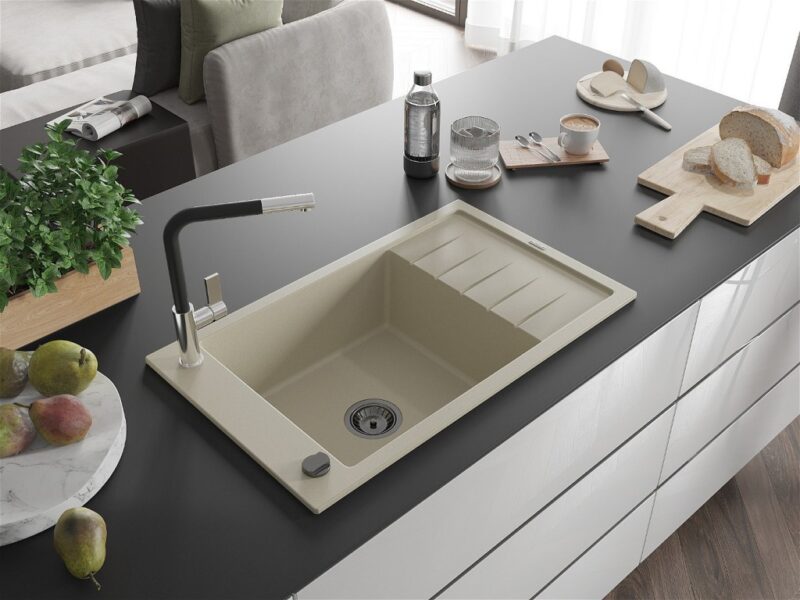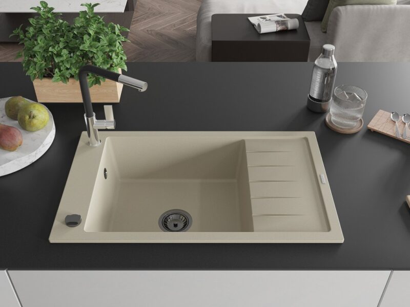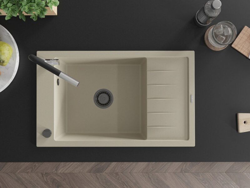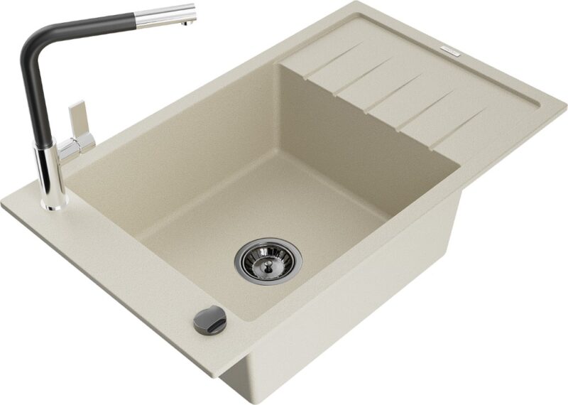 Technické dáta: drez: Rozmer: 795 x 480 x 200 mm Hĺbka komory: 190 mm Rozmery komory: 465×420 mm Priemer odtoku: ø90 mm Typ: 1-miska s krátkym odkvapkávačom Typ: Zapustené do pracovnej dosky Farba béžová Povrchová úprava sifónu: čierna Materiál: žula (80% žulové kamenivo, 20% živice) Prepadový otvor: Áno Otvory: (batérie, automatické) 2 Inštalácia: Univerzálna, je možné inštalovať s odkvapkávačom na ľavú alebo pravú stranu Vysoká odolnosť proti poškriabaniu a zmene farby Odolnosť proti tepelným šokom Ľahko čistiteľný povrch Jeden dodatočný vyfrézovaný otvor na samodierovanie ø35 kuchynská batéria: Materiál: mosadz Farba: chróm/čierna Hlava: Keramická Prevzdušňovač: Áno Typ: Jedna páka Rozsah výtoku: 245 mm Výška batérie: 307 mm(GT) Ean: 5905315060051