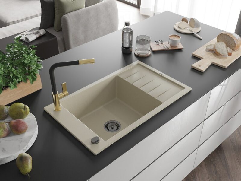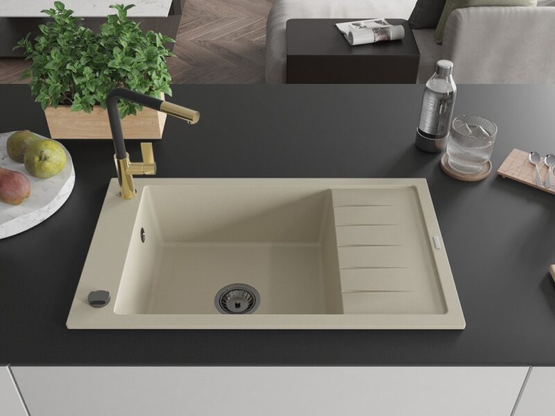 Technické údaje: Kuchyňský dřez: Rozměr: 795x480x200 mm Hloubka komory: 190 mm Rozměry komory: 465×420 mm Průměr odtoku: ø90 mm Typ: 1-miska s krátkým odkapávačem Typ: Zapuštěné do pracovní desky Barva: Béžová Povrchová úprava sifonu: černá Materiál: žula (80% žulové kamenivo 20% pryskyřice) Přepadový otvor: Ano Otvory: (baterie, automat) 2 Instalace: Univerzální, lze instalovat s odkapávačem na levou nebo pravou stranu Vysoká odolnost proti poškrábání a změně barvy Odolnost proti tepelným šokům Povrch pro snadné čištění Jeden dodatečný vyfrézovaný otvor pro samoděrování ø35 Kuchyňská baterie: Materiál: mosaz Barva: Zlatá/Černá Hlava: Keramická Perlátor: Ano Typ: Jednopáková Rozsah výtoku: 245 mm Výška baterie: 307 mm Ean: 5905315060082