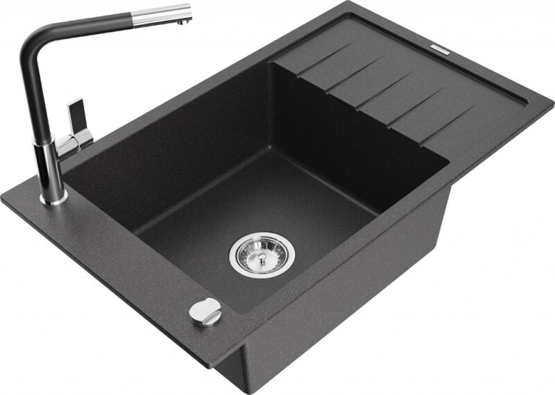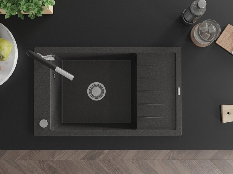 Technické údaje: Kuchyňský dřez: Rozměr: 795x480x200 mm Hloubka komory: 190 mm Rozměry komory: 465×420 mm Průměr odtoku: ø90 mm Typ: 1-miska s krátkým odkapávačem Typ: Zapuštěné do pracovní desky Barva: Skvrnitá černá Povrchová úprava sifonu: Chrome Materiál: žula (80% žulové kamenivo 20% pryskyřice) Přepadový otvor: Ano Otvory: (baterie, automat) 2 Instalace: Univerzální, lze instalovat s odkapávačem na levou nebo pravou stranu Vysoká odolnost proti poškrábání a změně barvy Odolnost proti tepelným šokům Povrch pro snadné čištění Jeden dodatečný vyfrézovaný otvor pro samoděrování ø35 Kuchyňská baterie: Materiál: mosaz Barva: chrom/černá Hlava: Keramická Perlátor: Ano Typ: Jednopáková Rozsah výtoku: 245 mm Výška baterie: 307 mm Ean: 5905315060303