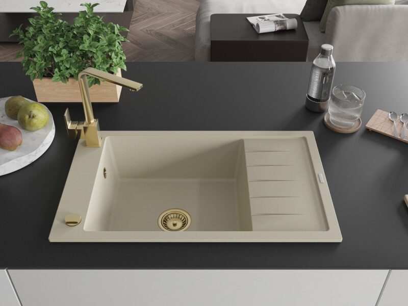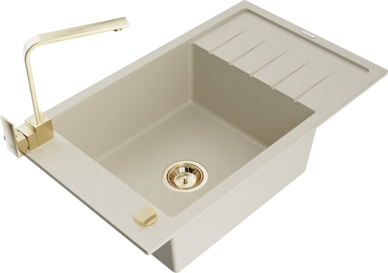 Technické dáta: drez: Rozmer: 795 x 480 x 200 mm Hĺbka komory: 190 mm Rozmery komory: 465×420 mm Priemer odtoku: ø90 mm Typ: 1-miska s krátkym odkvapkávačom Typ: Zapustené do pracovnej dosky Farba béžová Povrchová úprava sifónu: zlatá Materiál: žula (80% žulové kamenivo, 20% živice) Prepadový otvor: Áno Otvory: (batérie, automatické) 2 Inštalácia: Univerzálna, je možné inštalovať s odkvapkávačom na ľavú alebo pravú stranu Vysoká odolnosť proti poškriabaniu a zmene farby Odolnosť proti tepelným šokom Ľahko čistiteľný povrch Jeden dodatočný vyfrézovaný otvor na samodierovanie ø35 kuchynská batéria: Materiál: mosadz Farba: Zlatá Hlava: Keramická Prevzdušňovač: Áno Typ: Jedna páka Výška batérie: 290 mm Rozsah výtoku: 220 mm(GT) Ean: 5905315019516