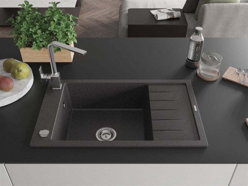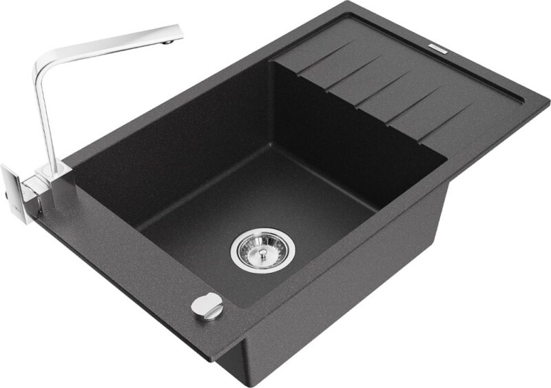 Technické dáta: drez: Rozmer: 795 x 480 x 200 mm Hĺbka komory: 190 mm Rozmery komory: 465×420 mm Priemer odtoku: ø90 mm Typ: 1-miska s krátkym odkvapkávačom Typ: Zapustené do pracovnej dosky Farba: Škvrnitá čierna Povrchová úprava sifónu: Chrome Materiál: žula (80% žulové kamenivo, 20% živice) Prepadový otvor: Áno Otvory: (batérie, automatické) 2 Inštalácia: Univerzálna, je možné inštalovať s odkvapkávačom na ľavú alebo pravú stranu Vysoká odolnosť proti poškriabaniu a zmene farby Odolnosť proti tepelným šokom Ľahko čistiteľný povrch Jeden dodatočný vyfrézovaný otvor na samodierovanie ø35 kuchynská batéria: Materiál: mosadz Farba: Chrome Hlava: Keramická Prevzdušňovač: Áno Typ: Jedna páka Výška batérie: 290 mm Rozsah výtoku: 220 mm(GT) Ean: 5905315019677