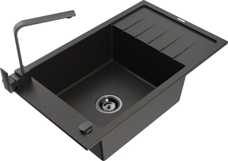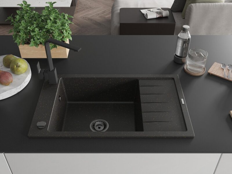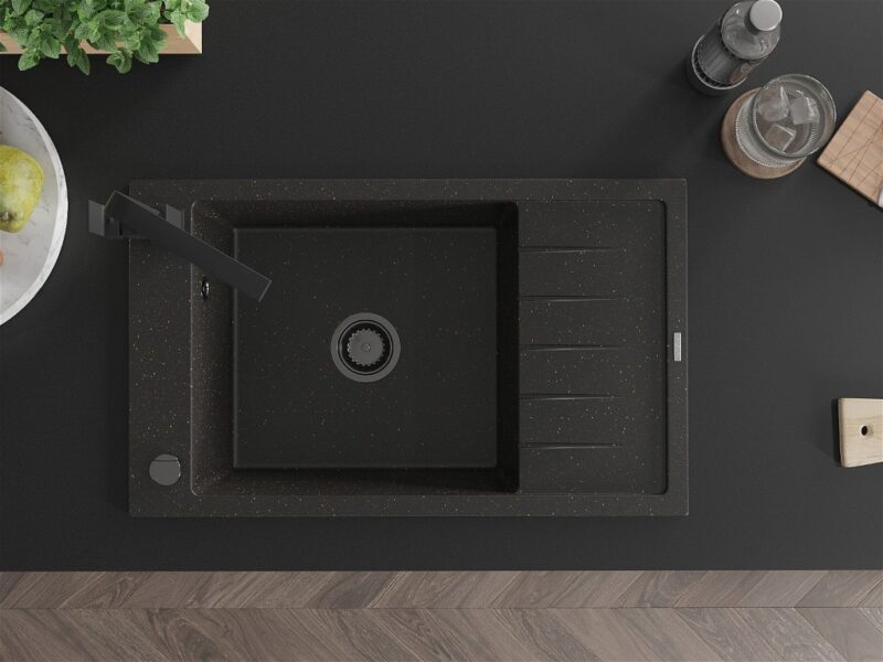 Technické dáta: drez: Rozmer: 795 x 480 x 200 mm Hĺbka komory: 190 mm Rozmery komory: 465×420 mm Priemer odtoku: ø90 mm Typ: 1-miska s krátkym odkvapkávačom Typ: Zapustené do pracovnej dosky Farba: čierna / zlatá metalíza Povrchová úprava sifónu: čierna Materiál: žula (80% žulové kamenivo, 20% živice) Prepadový otvor: Áno Otvory: (batérie, automatické) 2 Inštalácia: Univerzálna, je možné inštalovať s odkvapkávačom na ľavú alebo pravú stranu Vysoká odolnosť proti poškriabaniu a zmene farby Odolnosť proti tepelným šokom Ľahko čistiteľný povrch Jeden dodatočný vyfrézovaný otvor na samodierovanie ø35 kuchynská batéria: Materiál: mosadz Čierna farba Hlava: Keramická Prevzdušňovač: Áno Typ: Jedna páka Výška batérie: 290 mm Rozsah výtoku: 220 mm(GT) Ean: 5905315019653
