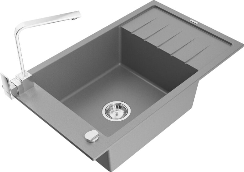 Technické dáta: drez: Rozmer: 795 x 480 x 200 mm Hĺbka komory: 190 mm Rozmery komory: 465×420 mm Priemer odtoku: ø90 mm Typ: 1-miska s krátkym odkvapkávačom Typ: Zapustené do pracovnej dosky Šedá farba Povrchová úprava sifónu: Chrome Materiál: žula (80% žulové kamenivo, 20% živice) Prepadový otvor: Áno Otvory: (batérie, automatické) 2 Inštalácia: Univerzálna, je možné inštalovať s odkvapkávačom na ľavú alebo pravú stranu Vysoká odolnosť proti poškriabaniu a zmene farby Odolnosť proti tepelným šokom Ľahko čistiteľný povrch Jeden dodatočný vyfrézovaný otvor na samodierovanie ø35 kuchynská batéria: Materiál: mosadz Farba: Chrome Hlava: Keramická Prevzdušňovač: Áno Typ: Jedna páka Výška batérie: 290 mm Rozsah výtoku: 220 mm(GT) Ean: 5905315019530