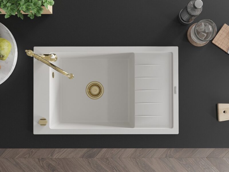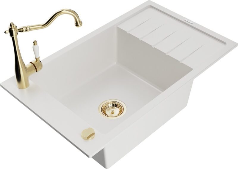 Technické dáta: drez: Rozmer: 795 x 480 x 200 mm Hĺbka komory: 190 mm Rozmery komory: 465×420 mm Priemer odtoku: ø90 mm Typ: 1-miska s krátkym odkvapkávačom Typ: Zapustené do pracovnej dosky biela farba Povrchová úprava sifónu: zlatá Materiál: žula (80% žulové kamenivo, 20% živice) Prepadový otvor: Áno Otvory: (batérie, automatické) 2 Inštalácia: Univerzálna, je možné inštalovať s odkvapkávačom na ľavú alebo pravú stranu Vysoká odolnosť proti poškriabaniu a zmene farby Odolnosť proti tepelným šokom Ľahko čistiteľný povrch Jeden dodatočný vyfrézovaný otvor na samodierovanie ø35 kuchynská batéria: Materiál: mosadz Farba: Zlatá Hlava: Keramická Prevzdušňovač: Áno Typ: Jedna páka Výška batérie: 290 mm Rozsah výtoku: 260 mm(GT) Ean: 5905315039965