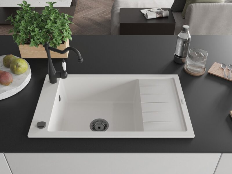 Technické dáta: drez: Rozmer: 795 x 480 x 200 mm Hĺbka komory: 190 mm Rozmery komory: 465×420 mm Priemer odtoku: ø90 mm Typ: 1-miska s krátkym odkvapkávačom Typ: Zapustené do pracovnej dosky biela farba Povrchová úprava sifónu: čierna Materiál: žula (80% žulové kamenivo, 20% živice) Prepadový otvor: Áno Otvory: (batérie, automatické) 2 Inštalácia: Univerzálna, je možné inštalovať s odkvapkávačom na ľavú alebo pravú stranu Vysoká odolnosť proti poškriabaniu a zmene farby Odolnosť proti tepelným šokom Ľahko čistiteľný povrch Jeden dodatočný vyfrézovaný otvor na samodierovanie ø35 kuchynská batéria: Materiál: mosadz Čierna farba Hlava: Keramická Prevzdušňovač: Áno Typ: Jedna páka Výška batérie: 290 mm Rozsah výtoku: 260 mm(GT) Ean: 5905315039972