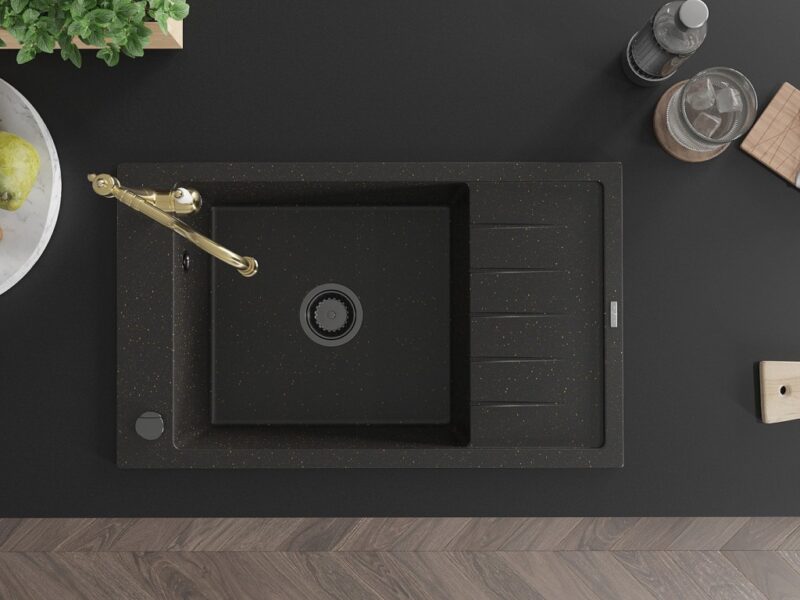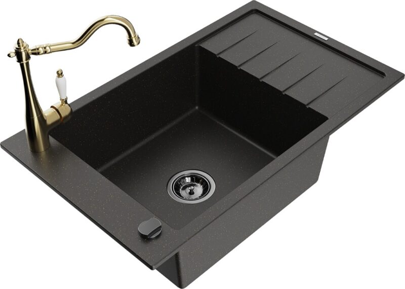 Technické dáta: drez: Rozmer: 795 x 480 x 200 mm Hĺbka komory: 190 mm Rozmery komory: 465×420 mm Priemer odtoku: ø90 mm Typ: 1-miska s krátkym odkvapkávačom Typ: Zapustené do pracovnej dosky Farba: čierna / zlatá metalíza Povrchová úprava sifónu: čierna Materiál: žula (80% žulové kamenivo, 20% živice) Prepadový otvor: Áno Otvory: (batérie, automatické) 2 Inštalácia: Univerzálna, je možné inštalovať s odkvapkávačom na ľavú alebo pravú stranu Vysoká odolnosť proti poškriabaniu a zmene farby Odolnosť proti tepelným šokom Ľahko čistiteľný povrch Jeden dodatočný vyfrézovaný otvor na samodierovanie ø35 kuchynská batéria: Materiál: mosadz Farba: Zlatá Hlava: Keramická Prevzdušňovač: Áno Typ: Jedna páka Výška batérie: 290 mm Rozsah výtoku: 260 mm(GT) Ean: 5905315040138