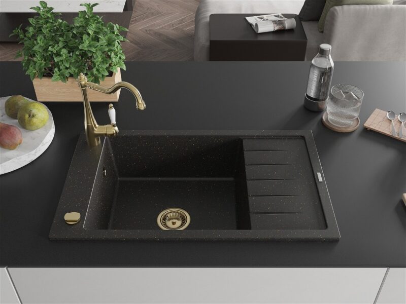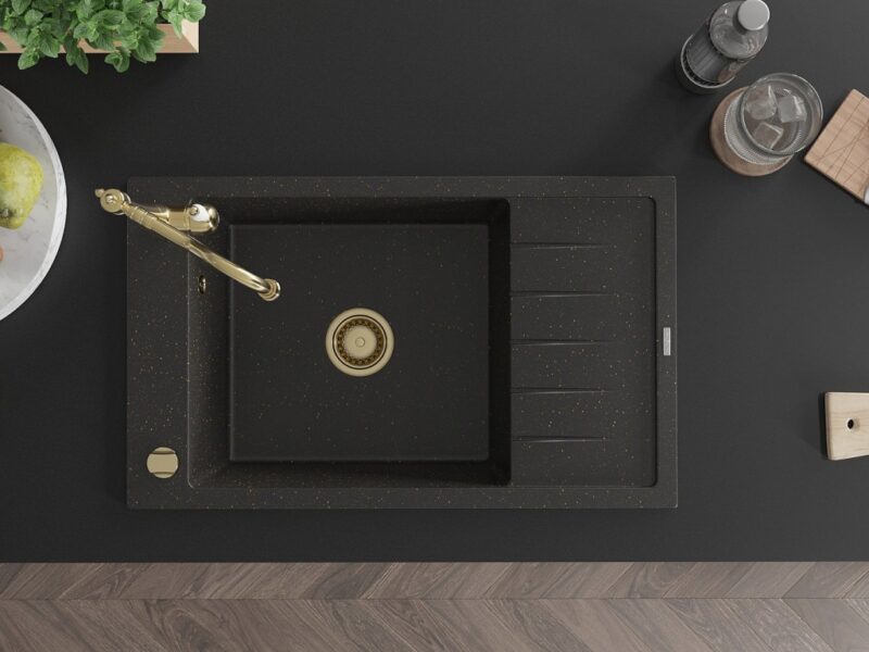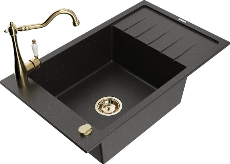 Technické dáta: drez: Rozmer: 795 x 480 x 200 mm Hĺbka komory: 190 mm Rozmery komory: 465×420 mm Priemer odtoku: ø90 mm Typ: 1-miska s krátkym odkvapkávačom Typ: Zapustené do pracovnej dosky Farba: čierna / zlatá metalíza Povrchová úprava sifónu: zlatá Materiál: žula (80% žulové kamenivo, 20% živice) Prepadový otvor: Áno Otvory: (batérie, automatické) 2 Inštalácia: Univerzálna, je možné inštalovať s odkvapkávačom na ľavú alebo pravú stranu Vysoká odolnosť proti poškriabaniu a zmene farby Odolnosť proti tepelným šokom Ľahko čistiteľný povrch Jeden dodatočný vyfrézovaný otvor na samodierovanie ø35 kuchynská batéria: Materiál: mosadz Farba: Zlatá Hlava: Keramická Prevzdušňovač: Áno Typ: Jedna páka Výška batérie: 290 mm Rozsah výtoku: 260 mm(GT) Ean: 5905315040121