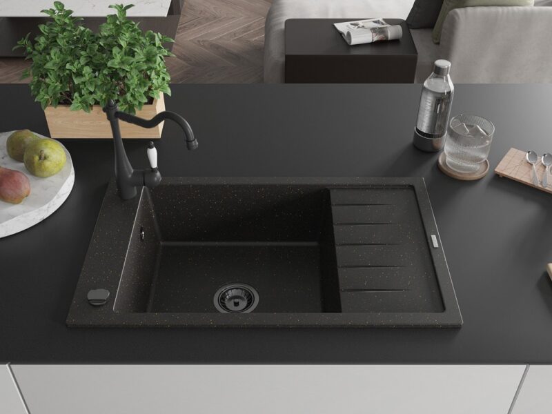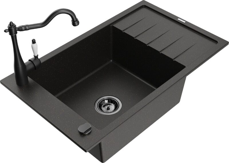 Technické dáta: drez: Rozmer: 795 x 480 x 200 mm Hĺbka komory: 190 mm Rozmery komory: 465×420 mm Priemer odtoku: ø90 mm Typ: 1-miska s krátkym odkvapkávačom Typ: Zapustené do pracovnej dosky Farba: čierna / zlatá metalíza Povrchová úprava sifónu: čierna Materiál: žula (80% žulové kamenivo, 20% živice) Prepadový otvor: Áno Otvory: (batérie, automatické) 2 Inštalácia: Univerzálna, je možné inštalovať s odkvapkávačom na ľavú alebo pravú stranu Vysoká odolnosť proti poškriabaniu a zmene farby Odolnosť proti tepelným šokom Ľahko čistiteľný povrch Jeden dodatočný vyfrézovaný otvor na samodierovanie ø35 kuchynská batéria: Materiál: mosadz Čierna farba Hlava: Keramická Prevzdušňovač: Áno Typ: Jedna páka Výška batérie: 290 mm Rozsah výtoku: 260 mm(GT) Ean: 5905315040145