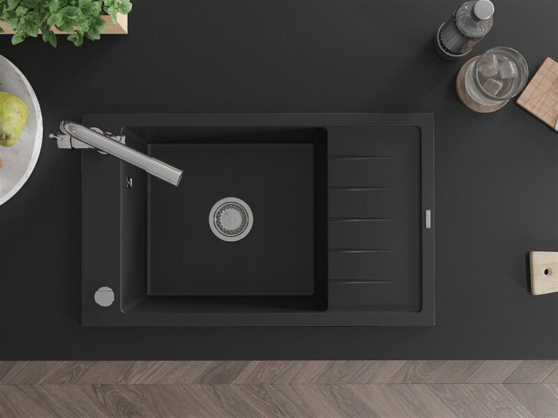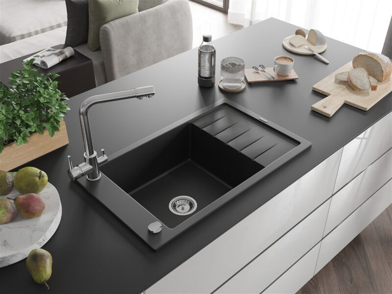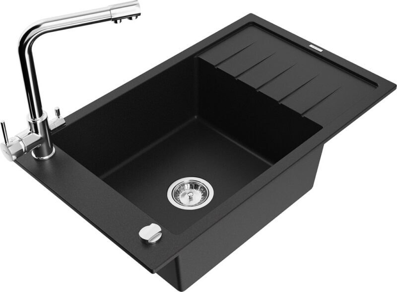 Technické dáta: drez: Rozmer: 795 x 480 x 200 mm Hĺbka komory: 190 mm Rozmery komory: 465×420 mm Priemer odtoku: ø90 mm Typ: 1-miska s krátkym odkvapkávačom Typ: Zapustené do pracovnej dosky Čierna farba Povrchová úprava sifónu: Chrome Materiál: žula (80% žulové kamenivo, 20% živice) Prepadový otvor: Áno Otvory: (batérie, automatické) 2 Inštalácia: Univerzálna, je možné inštalovať s odkvapkávačom na ľavú alebo pravú stranu Vysoká odolnosť proti poškriabaniu a zmene farby Odolnosť proti tepelným šokom Ľahko čistiteľný povrch Jeden dodatočný vyfrézovaný otvor na samodierovanie ø35 kuchynská batéria: Materiál: mosadz Farba: Chrome Hlava: Keramická Prevzdušňovač: Áno Typ: Dve rukoväte Rozsah výtoku: 235 mm Výška batérie: 315 mm Dvojhlavá batéria s prídavným kanálom pre filtrovanú pitnú vodu(GT) Ean: 5905315024848