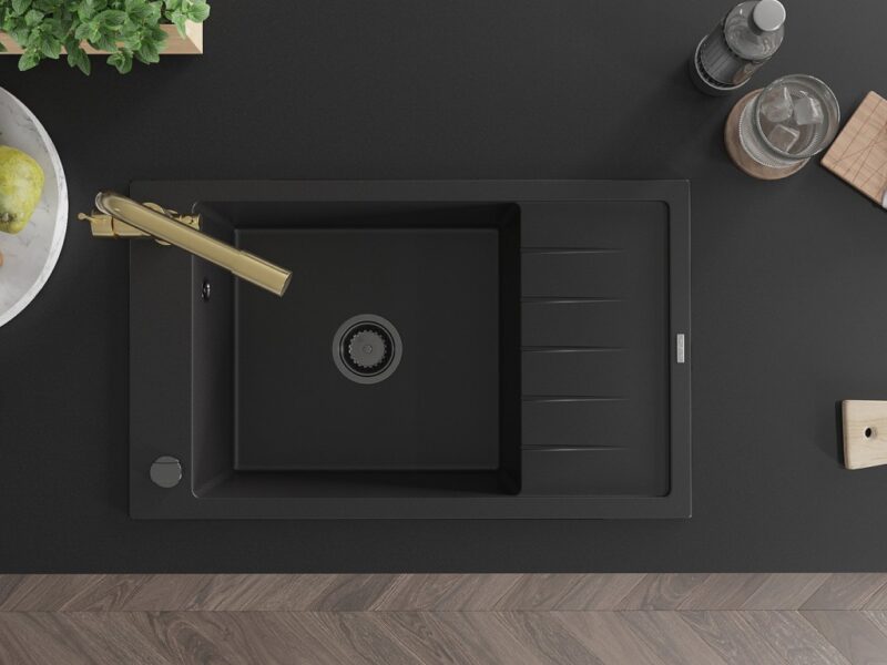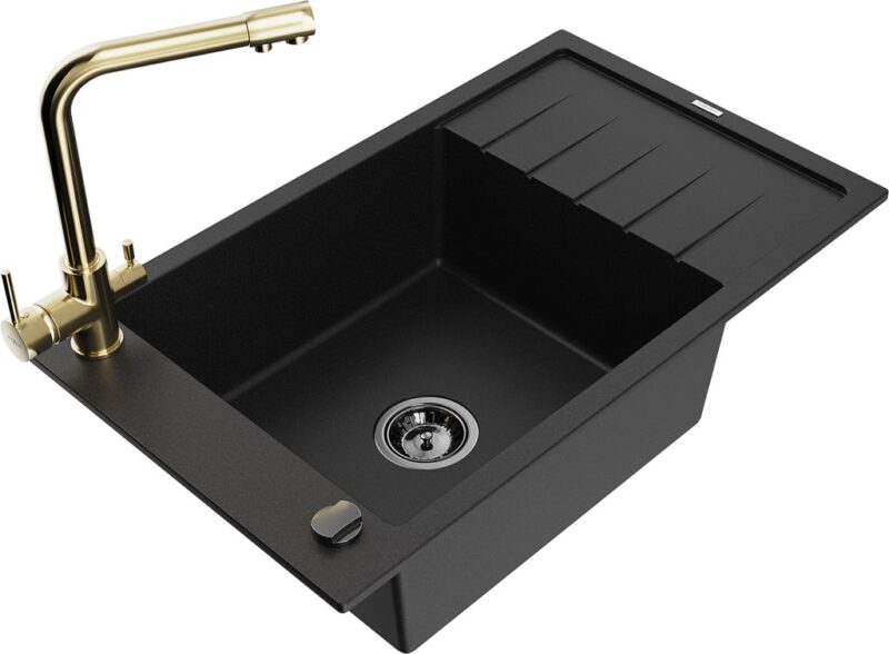 Technické dáta: drez: Rozmer: 795 x 480 x 200 mm Hĺbka komory: 190 mm Rozmery komory: 465×420 mm Priemer odtoku: ø90 mm Typ: 1-miska s krátkym odkvapkávačom Typ: Zapustené do pracovnej dosky Čierna farba Povrchová úprava sifónu: čierna Materiál: žula (80% žulové kamenivo, 20% živice) Prepadový otvor: Áno Otvory: (batérie, automatické) 2 Inštalácia: Univerzálna, je možné inštalovať s odkvapkávačom na ľavú alebo pravú stranu Vysoká odolnosť proti poškriabaniu a zmene farby Odolnosť proti tepelným šokom Ľahko čistiteľný povrch Jeden dodatočný vyfrézovaný otvor na samodierovanie ø35 kuchynská batéria: Materiál: mosadz Farba: Zlatá Hlava: Keramická Prevzdušňovač: Áno Typ: Dve rukoväte Rozsah výtoku: 235 mm Výška batérie: 315 mm Dvojhlavá batéria s prídavným kanálom pre filtrovanú pitnú vodu(GT) Ean: 5905315024862