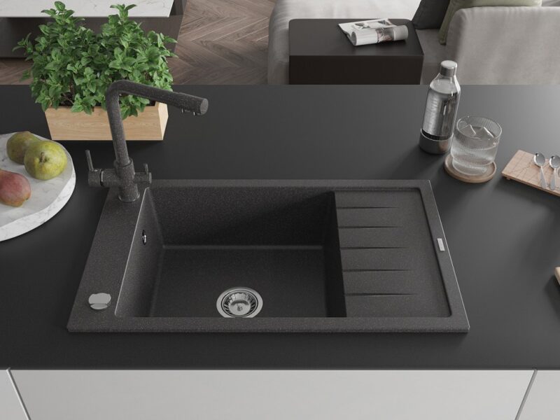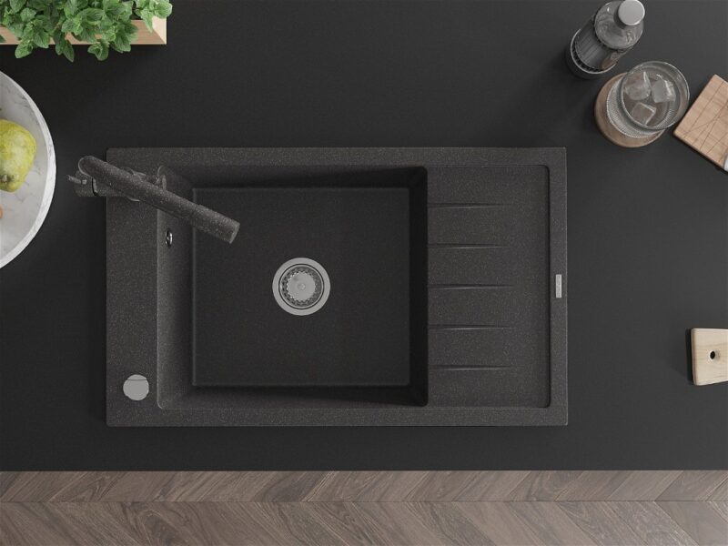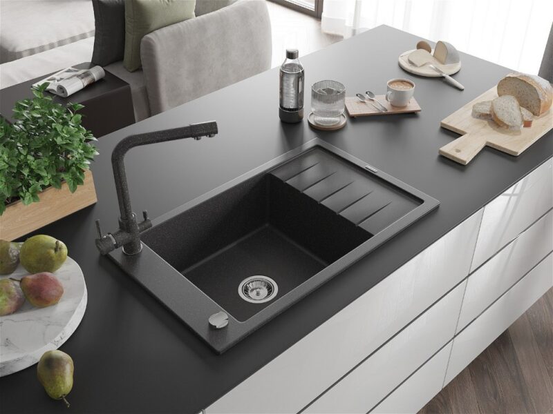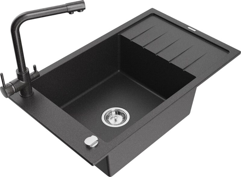 Technické dáta: drez: Rozmer: 795 x 480 x 200 mm Hĺbka komory: 190 mm Rozmery komory: 465×420 mm Priemer odtoku: ø90 mm Typ: 1-miska s krátkym odkvapkávačom Typ: Zapustené do pracovnej dosky Farba: Škvrnitá čierna Povrchová úprava sifónu: Chrome Materiál: žula (80% žulové kamenivo, 20% živice) Prepadový otvor: Áno Otvory: (batérie, automatické) 2 Inštalácia: Univerzálna, je možné inštalovať s odkvapkávačom na ľavú alebo pravú stranu Vysoká odolnosť proti poškriabaniu a zmene farby Odolnosť proti tepelným šokom Ľahko čistiteľný povrch Jeden dodatočný vyfrézovaný otvor na samodierovanie ø35 kuchynská batéria: Materiál: mosadz Farba: Škvrnitá čierna Hlava: Keramická Prevzdušňovač: Áno Typ: Dve rukoväte Rozsah výtoku: 235 mm Výška batérie: 315 mm Dvojhlavá batéria s prídavným kanálom pre filtrovanú pitnú vodu(GT) Ean: 5905315024831