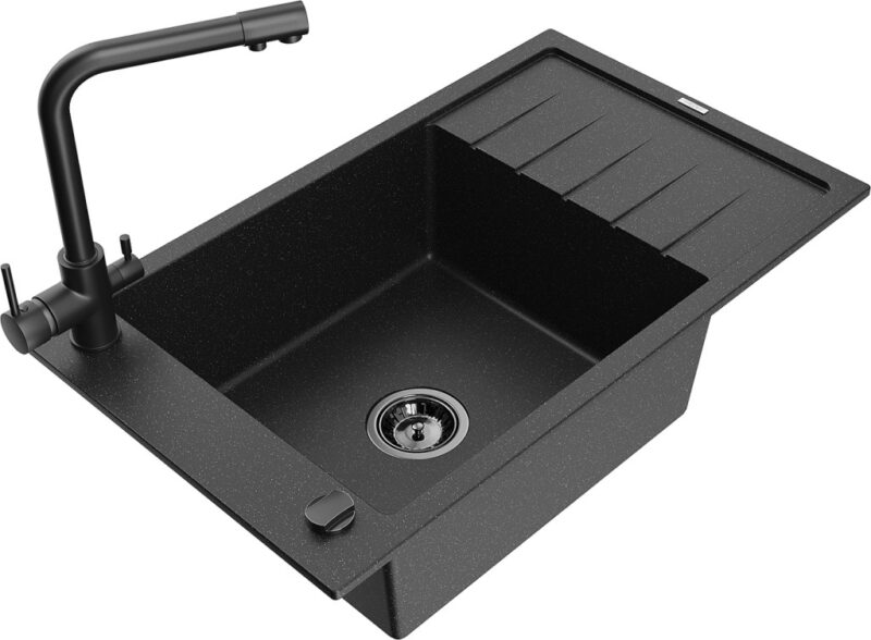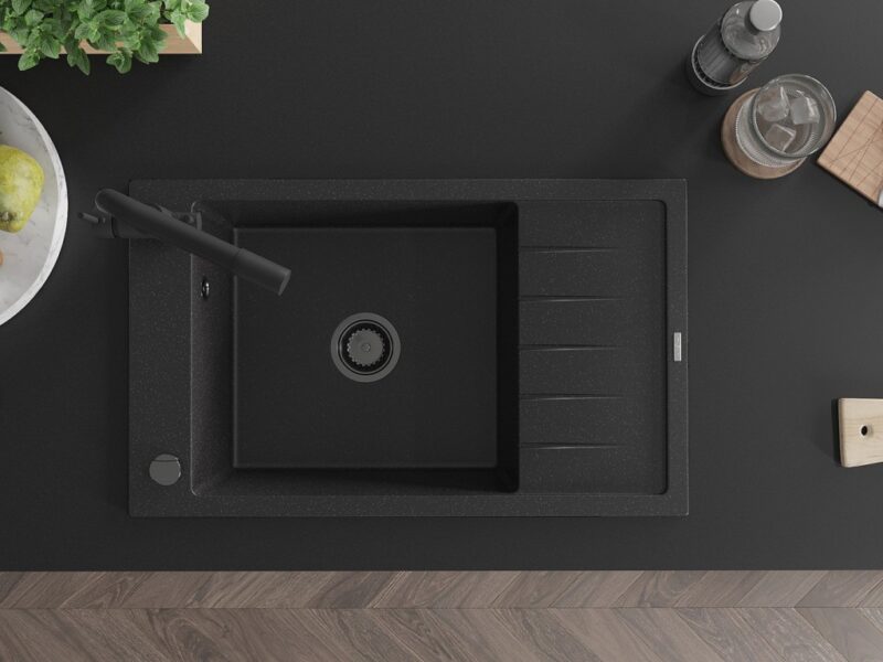 Technické dáta: drez: Rozmer: 795 x 480 x 200 mm Hĺbka komory: 190 mm Rozmery komory: 465×420 mm Priemer odtoku: ø90 mm Typ: 1-miska s krátkym odkvapkávačom Typ: Zapustené do pracovnej dosky Farba: čierna/strieborná metalíza Povrchová úprava sifónu: čierna Materiál: žula (80% žulové kamenivo, 20% živice) Prepadový otvor: Áno Otvory: (batérie, automatické) 2 Inštalácia: Univerzálna, je možné inštalovať s odkvapkávačom na ľavú alebo pravú stranu Vysoká odolnosť proti poškriabaniu a zmene farby Odolnosť proti tepelným šokom Ľahko čistiteľný povrch Jeden dodatočný vyfrézovaný otvor na samodierovanie ø35 kuchynská batéria: Materiál: mosadz Čierna farba Hlava: Keramická Prevzdušňovač: Áno Typ: Dve rukoväte Rozsah výtoku: 235 mm Výška batérie: 315 mm Dvojhlavá batéria s prídavným kanálom pre filtrovanú pitnú vodu(GT) Ean: 5905315024725
