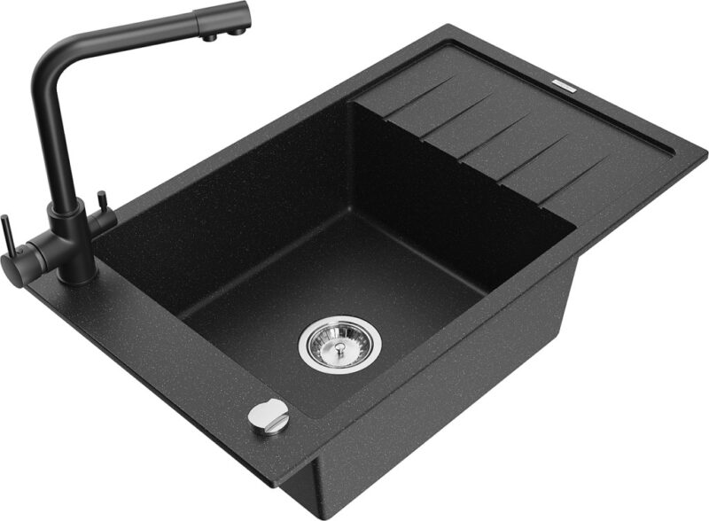 Technické dáta: drez: Rozmer: 795 x 480 x 200 mm Hĺbka komory: 190 mm Rozmery komory: 465×420 mm Priemer odtoku: ø90 mm Typ: 1-miska s krátkym odkvapkávačom Typ: Zapustené do pracovnej dosky Farba: čierna/strieborná metalíza Povrchová úprava sifónu: Chrome Materiál: žula (80% žulové kamenivo, 20% živice) Prepadový otvor: Áno Otvory: (batérie, automatické) 2 Inštalácia: Univerzálna, je možné inštalovať s odkvapkávačom na ľavú alebo pravú stranu Vysoká odolnosť proti poškriabaniu a zmene farby Odolnosť proti tepelným šokom Ľahko čistiteľný povrch Jeden dodatočný vyfrézovaný otvor na samodierovanie ø35 kuchynská batéria: Materiál: mosadz Čierna farba Hlava: Keramická Prevzdušňovač: Áno Typ: Dve rukoväte Rozsah výtoku: 235 mm Výška batérie: 315 mm Dvojhlavá batéria s prídavným kanálom pre filtrovanú pitnú vodu(GT) Ean: 5905315024732
