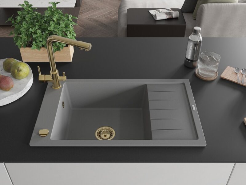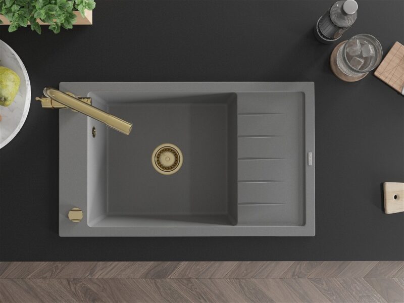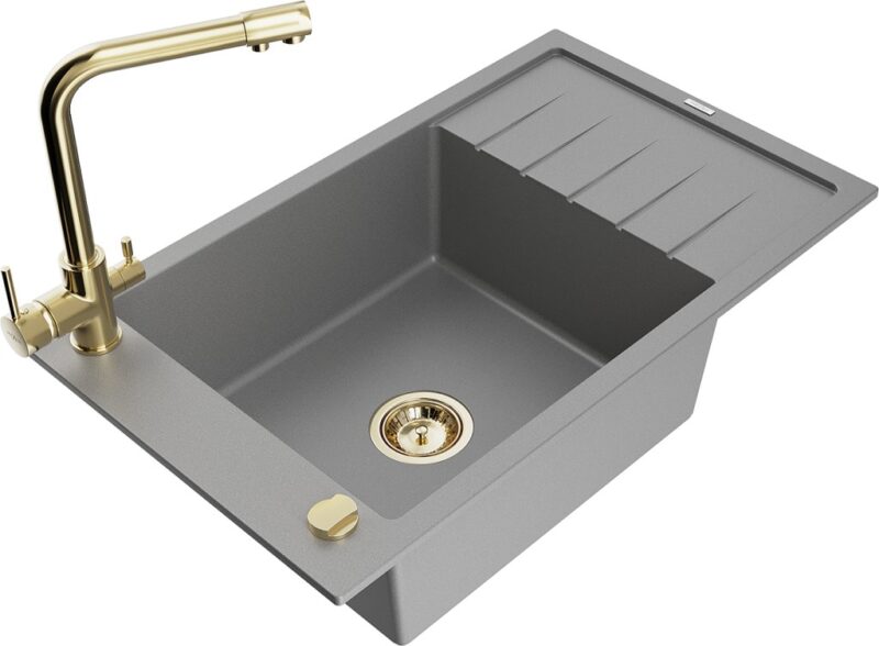 Technické dáta: drez: Rozmer: 795 x 480 x 200 mm Hĺbka komory: 190 mm Rozmery komory: 465×420 mm Priemer odtoku: ø90 mm Typ: 1-miska s krátkym odkvapkávačom Typ: Zapustené do pracovnej dosky Šedá farba Povrchová úprava sifónu: zlatá Materiál: žula (80% žulové kamenivo, 20% živice) Prepadový otvor: Áno Otvory: (batérie, automatické) 2 Inštalácia: Univerzálna, je možné inštalovať s odkvapkávačom na ľavú alebo pravú stranu Vysoká odolnosť proti poškriabaniu a zmene farby Odolnosť proti tepelným šokom Ľahko čistiteľný povrch Jeden dodatočný vyfrézovaný otvor na samodierovanie ø35 kuchynská batéria: Materiál: mosadz Farba: Zlatá Hlava: Keramická Prevzdušňovač: Áno Typ: Dve rukoväte Rozsah výtoku: 235 mm Výška batérie: 315 mm Dvojhlavá batéria s prídavným kanálom pre filtrovanú pitnú vodu(GT) Ean: 5905315024664