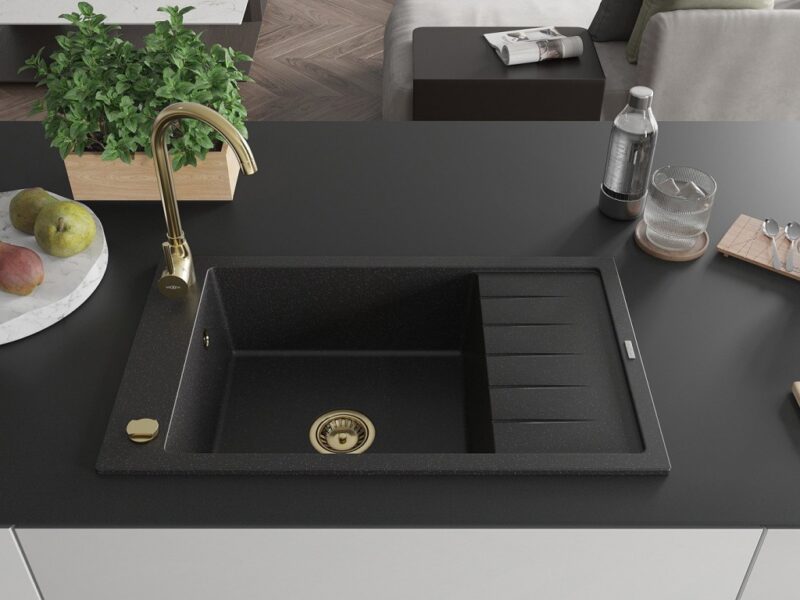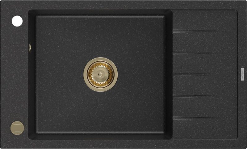 MEXEN/S MEXEN/S – Elias granitový drez 1 s odkvapkávačom 795 x 480 mm, čierna / strieborný metalik, + zlatý sifón 6511791005-73-G