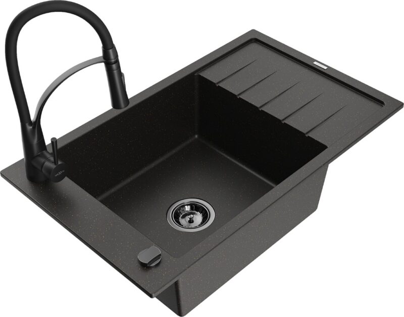 Technické dáta: drez: Rozmer: 795 x 480 x 200 mm Hĺbka komory: 190 mm Rozmery komory: 465×420 mm Priemer odtoku: ø90 mm Typ: 1-miska s krátkym odkvapkávačom Typ: Zapustené do pracovnej dosky Farba: čierna / zlatá metalíza Povrchová úprava sifónu: čierna Materiál: žula (80% žulové kamenivo, 20% živice) Prepadový otvor: Áno Otvory: (batérie, automatické) 2 Inštalácia: Univerzálna, je možné inštalovať s odkvapkávačom na ľavú alebo pravú stranu Vysoká odolnosť proti poškriabaniu a zmene farby Odolnosť proti tepelným šokom Ľahko čistiteľný povrch Jeden dodatočný vyfrézovaný otvor na samodierovanie ø35 kuchynská batéria: Materiál: mosadz Čierna farba Hlava: Keramická Prevzdušňovač: Áno Typ: Jedna páka Výška batérie: 430 mm Rozsah výtoku: 185 mm Batéria má výsuvný výtok(GT) Ean: 5905315046161