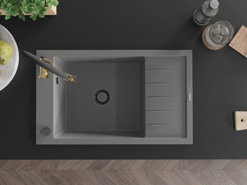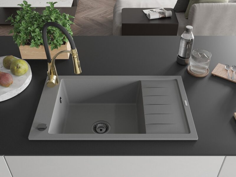 Technické dáta: drez: Rozmer: 795 x 480 x 200 mm Hĺbka komory: 190 mm Rozmery komory: 465×420 mm Priemer odtoku: ø90 mm Typ: 1-miska s krátkym odkvapkávačom Typ: Zapustené do pracovnej dosky Šedá farba Povrchová úprava sifónu: čierna Materiál: žula (80% žulové kamenivo, 20% živice) Prepadový otvor: Áno Otvory: (batérie, automatické) 2 Inštalácia: Univerzálna, je možné inštalovať s odkvapkávačom na ľavú alebo pravú stranu Vysoká odolnosť proti poškriabaniu a zmene farby Odolnosť proti tepelným šokom Ľahko čistiteľný povrch Jeden dodatočný vyfrézovaný otvor na samodierovanie ø35 kuchynská batéria: Materiál: mosadz Farba Zlatá/Čierna Hlava: Keramická Prevzdušňovač: Áno Typ: Jedna páka Výška batérie: 430 mm Rozsah výtoku: 185 mm Batéria má výsuvný výtok(GT) Ean: 5905315046031
