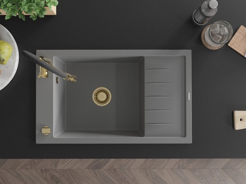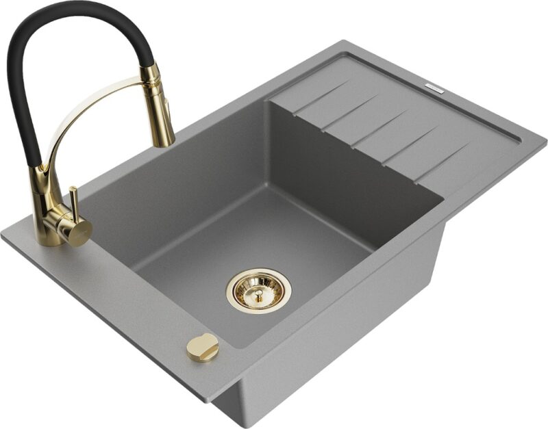 Technické dáta: drez: Rozmer: 795 x 480 x 200 mm Hĺbka komory: 190 mm Rozmery komory: 465×420 mm Priemer odtoku: ø90 mm Typ: 1-miska s krátkym odkvapkávačom Typ: Zapustené do pracovnej dosky Šedá farba Povrchová úprava sifónu: zlatá Materiál: žula (80% žulové kamenivo, 20% živice) Prepadový otvor: Áno Otvory: (batérie, automatické) 2 Inštalácia: Univerzálna, je možné inštalovať s odkvapkávačom na ľavú alebo pravú stranu Vysoká odolnosť proti poškriabaniu a zmene farby Odolnosť proti tepelným šokom Ľahko čistiteľný povrch Jeden dodatočný vyfrézovaný otvor na samodierovanie ø35 kuchynská batéria: Materiál: mosadz Farba Zlatá/Čierna Hlava: Keramická Prevzdušňovač: Áno Typ: Jedna páka Výška batérie: 430 mm Rozsah výtoku: 185 mm Batéria má výsuvný výtok(GT) Ean: 5905315046024