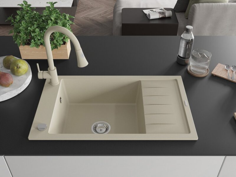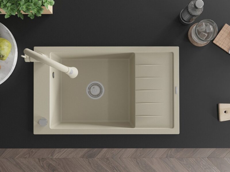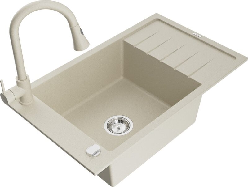 Technické dáta: drez: Rozmer: 795 x 480 x 200 mm Hĺbka komory: 190 mm Rozmery komory: 465×420 mm Priemer odtoku: ø90 mm Typ: 1-miska s krátkym odkvapkávačom Typ: Zapustené do pracovnej dosky Farba béžová Povrchová úprava sifónu: Chrome Materiál: žula (80% žulové kamenivo, 20% živice) Prepadový otvor: Áno Otvory: (batérie, automatické) 2 Inštalácia: Univerzálna, je možné inštalovať s odkvapkávačom na ľavú alebo pravú stranu Vysoká odolnosť proti poškriabaniu a zmene farby Odolnosť proti tepelným šokom Ľahko čistiteľný povrch Jeden dodatočný vyfrézovaný otvor na samodierovanie ø35 kuchynská batéria: Materiál: mosadz Farba béžová Hlava: Keramická Prevzdušňovač: Áno Typ: Jedna páka Výška batérie: 380 mm Rozsah výtoku: 252 mm Typ výtoku: Výsuvný(GT) Ean: 5905315029744