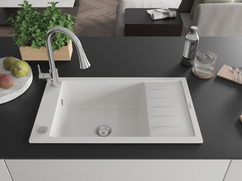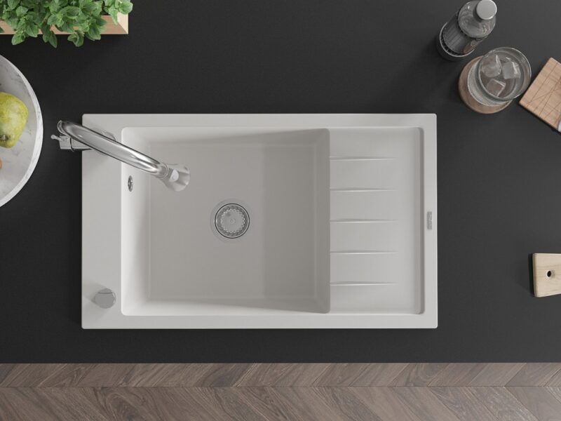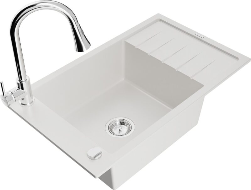 Technické dáta: drez: Rozmer: 795 x 480 x 200 mm Hĺbka komory: 190 mm Rozmery komory: 465×420 mm Priemer odtoku: ø90 mm Typ: 1-miska s krátkym odkvapkávačom Typ: Zapustené do pracovnej dosky biela farba Povrchová úprava sifónu: Chrome Materiál: žula (80% žulové kamenivo, 20% živice) Prepadový otvor: Áno Otvory: (batérie, automatické) 2 Inštalácia: Univerzálna, je možné inštalovať s odkvapkávačom na ľavú alebo pravú stranu Vysoká odolnosť proti poškriabaniu a zmene farby Odolnosť proti tepelným šokom Ľahko čistiteľný povrch Jeden dodatočný vyfrézovaný otvor na samodierovanie ø35 kuchynská batéria: Materiál: mosadz Farba: Chrome Hlava: Keramická Prevzdušňovač: Áno Typ: Jedna páka Výška batérie: 380 mm Rozsah výtoku: 252 mm Typ výtoku: Výsuvný(GT) Ean: 5905315029690